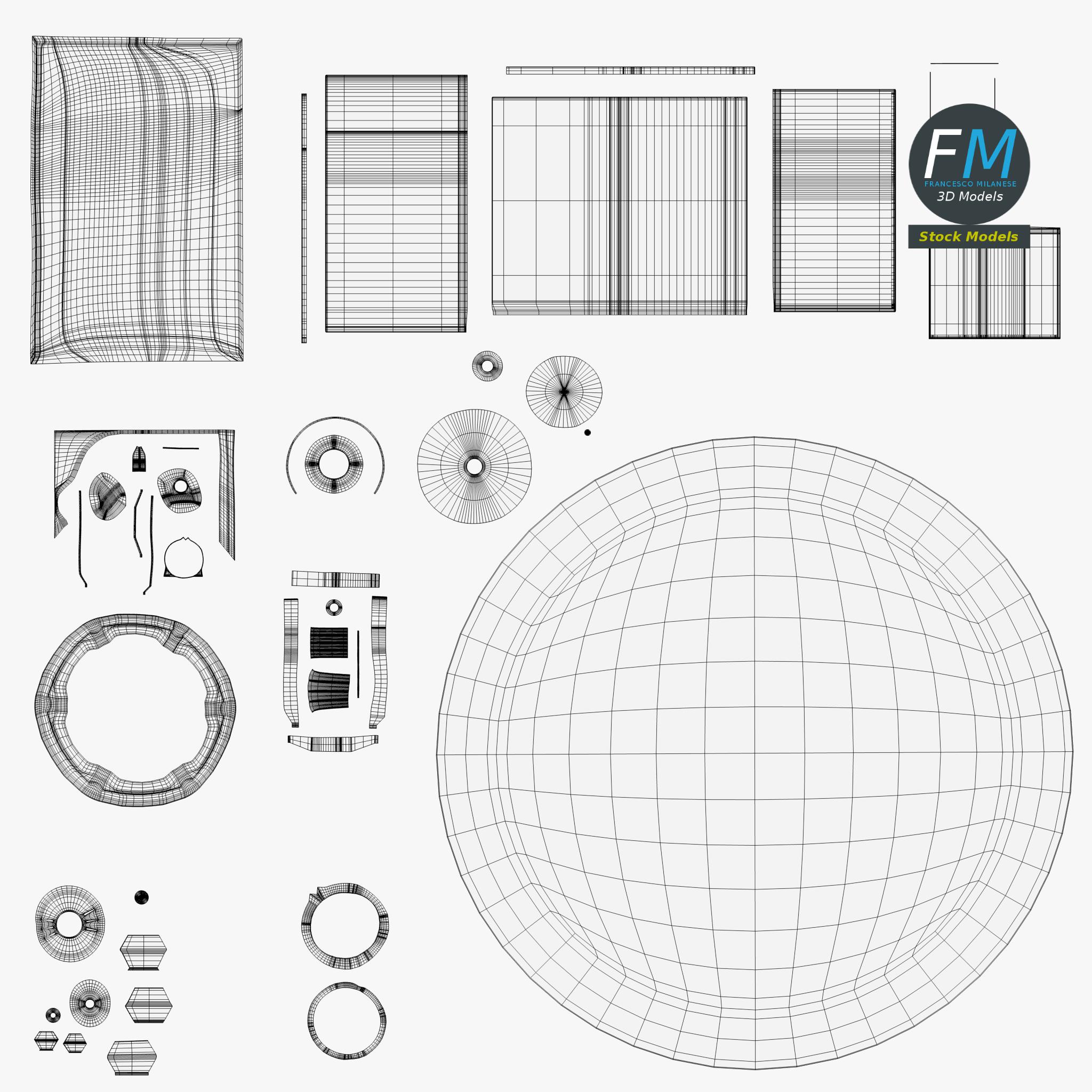 2 Objects (meshes), 1 PBR Material, UV unwrapped (overlapping UV Layout map provided in the package); UV-mapped Textures.