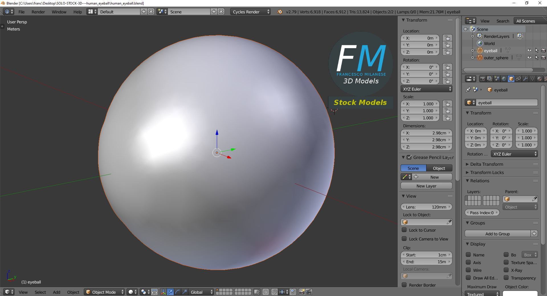 Human eyeball 3D Model. 2 individual objects (glass outer sphere; eyeball), each one with its own non overlapping UV Layout map, Material and PBR Textures set. Production-ready 3D Model, with PBR materials, textures, non overlapping UV Layout map provided in the package.