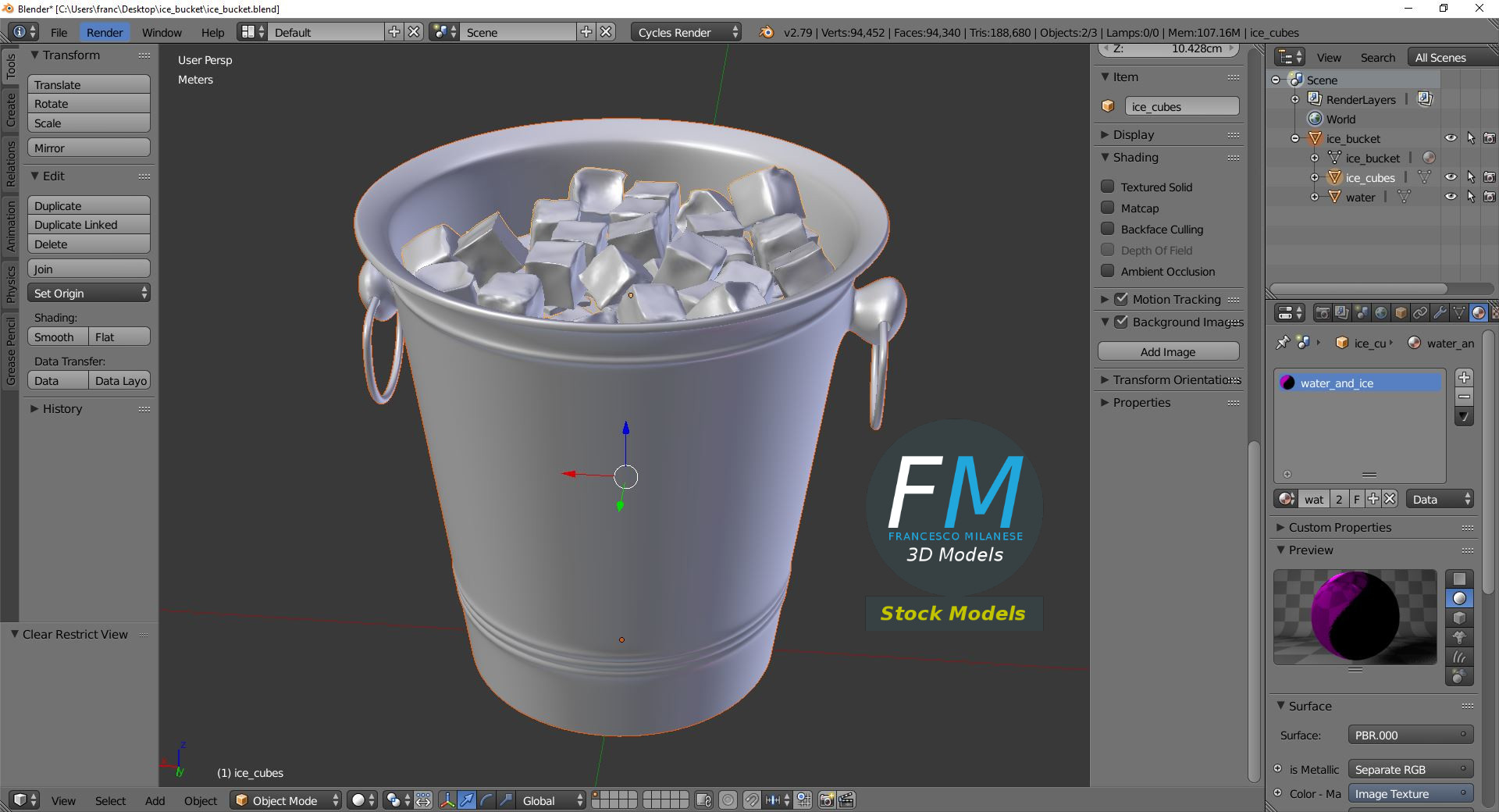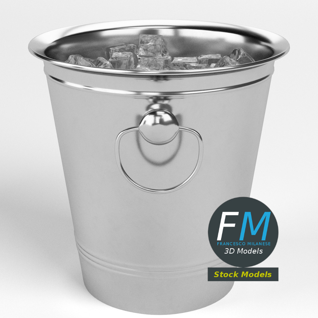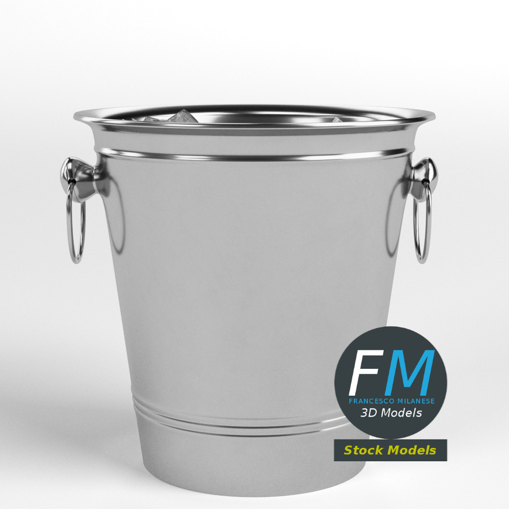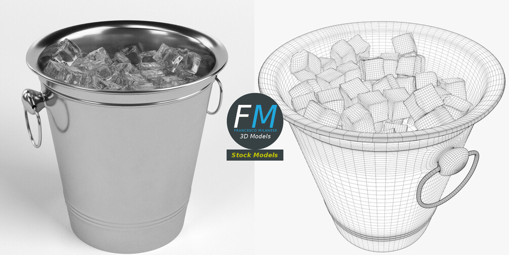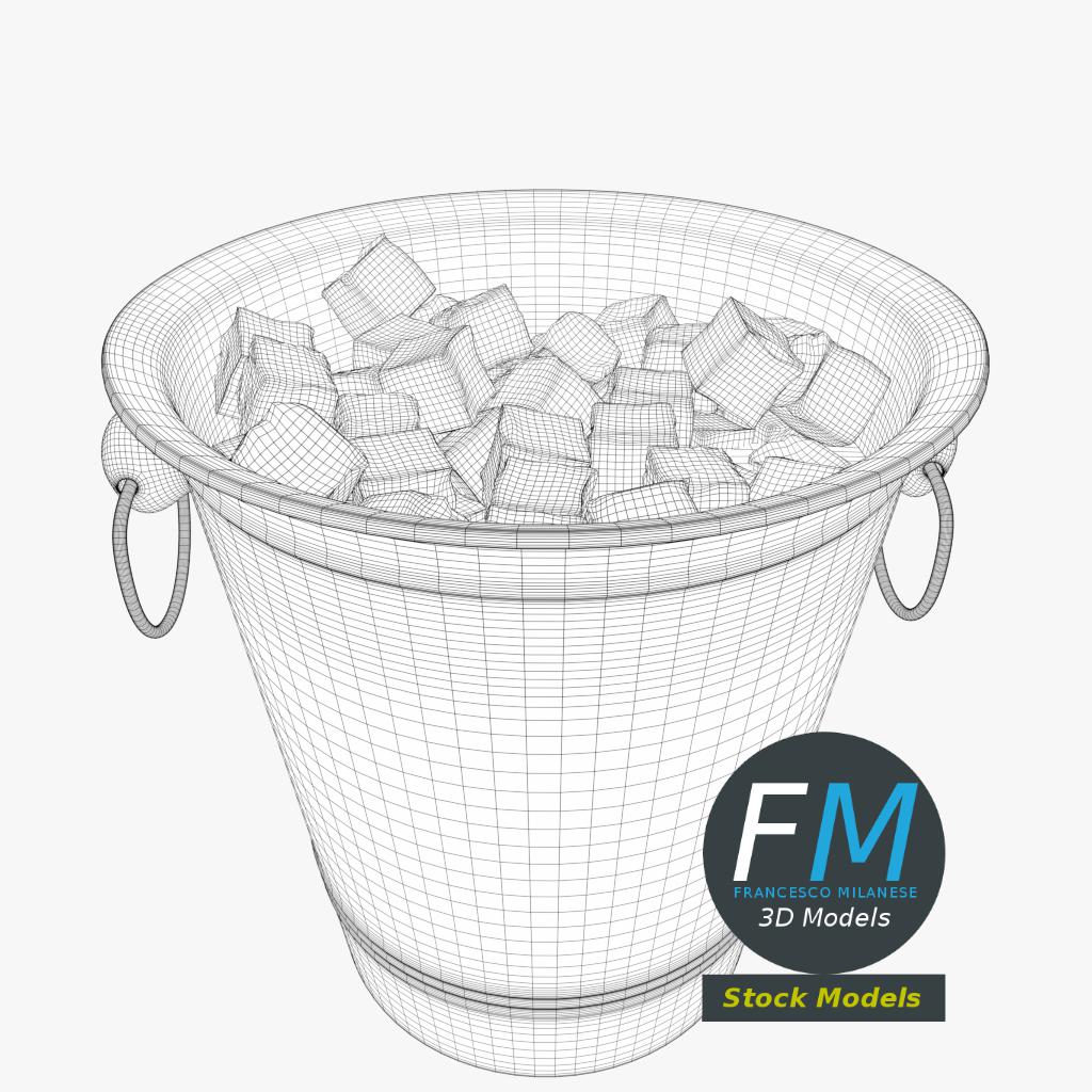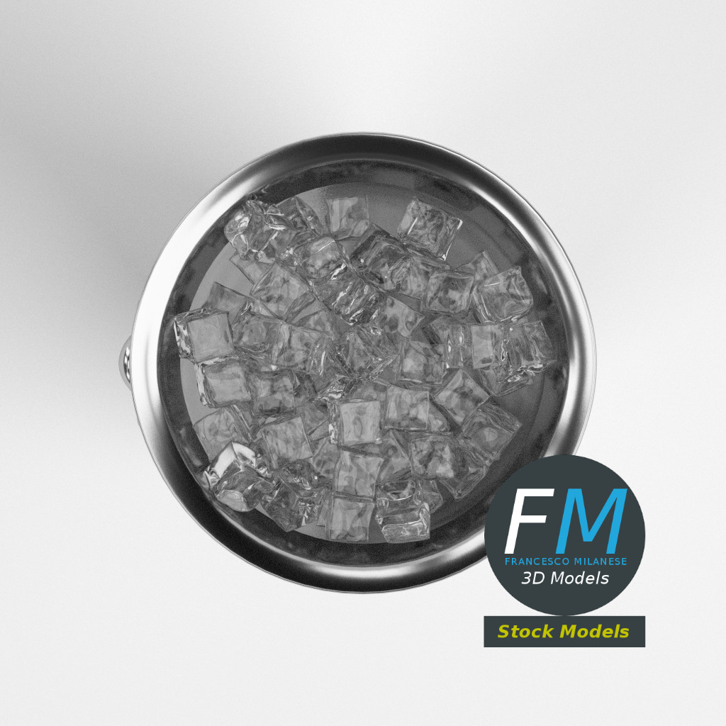 Ice bucket 3D Model. 3 individual objects (bucket, water, ice cubes) sharing 2 non overlapping UV Layout map, Materials (bucket; water and ice cubes) and PBR Textures set. Production-ready 3D Model, with PBR materials, textures, non overlapping UV Layout map provided in the package.