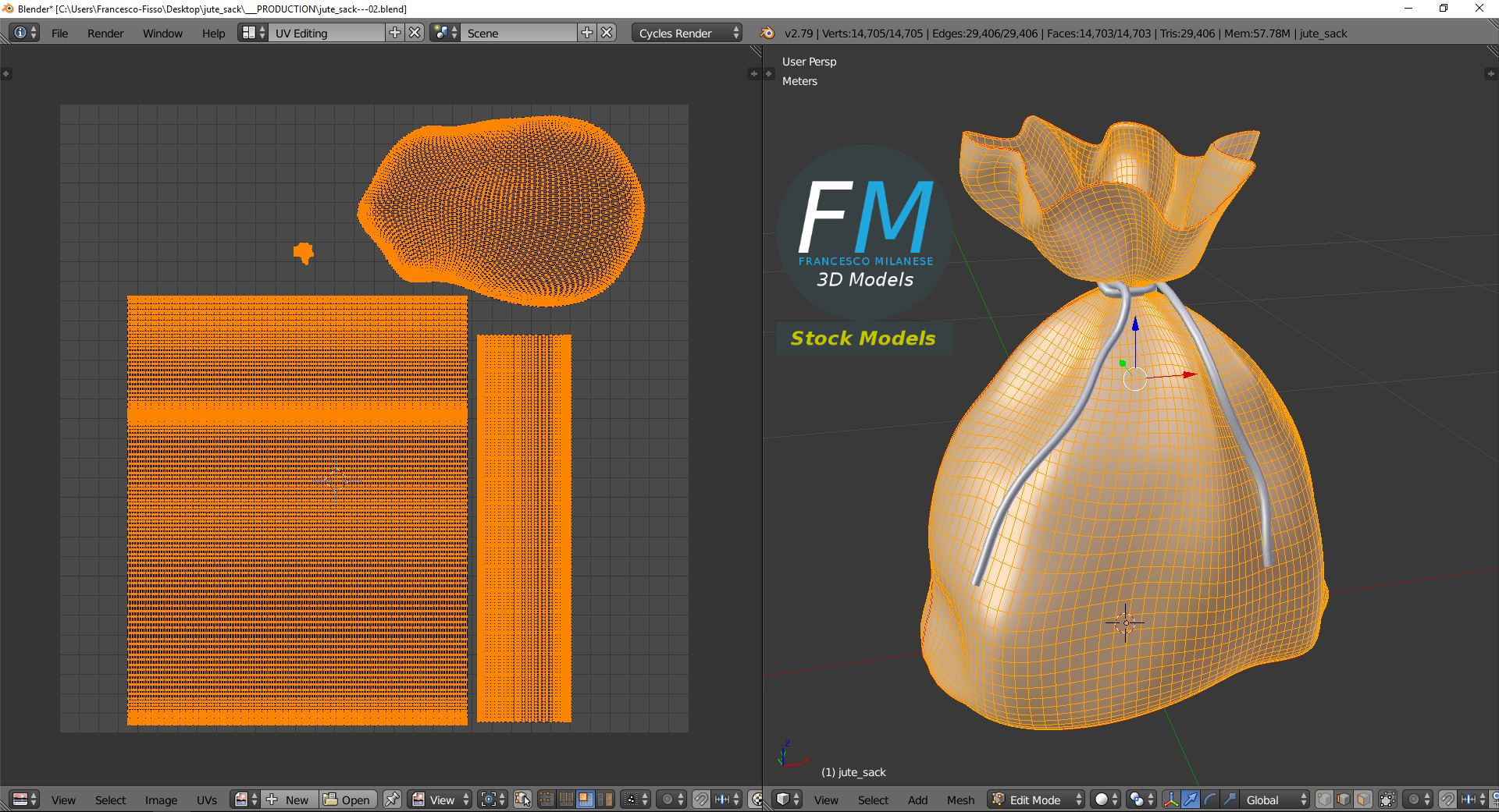 Jute (or burlap) sack 3D Model. 2 objects (jute sack, rope), each one with its own non overlapping UV Layout map, Material and PBR Textures set. Production-ready 3D Model, with PBR materials, textures, non overlapping UV Layout map provided in the package.