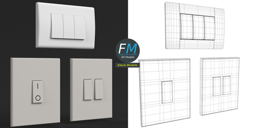 A set of 3 light switches 3D Models; simple yet useful models for architecture / interior renderings. Production-ready 3D Model, with PBR materials, textures, and non overlapping UV Layout map provided in the package.