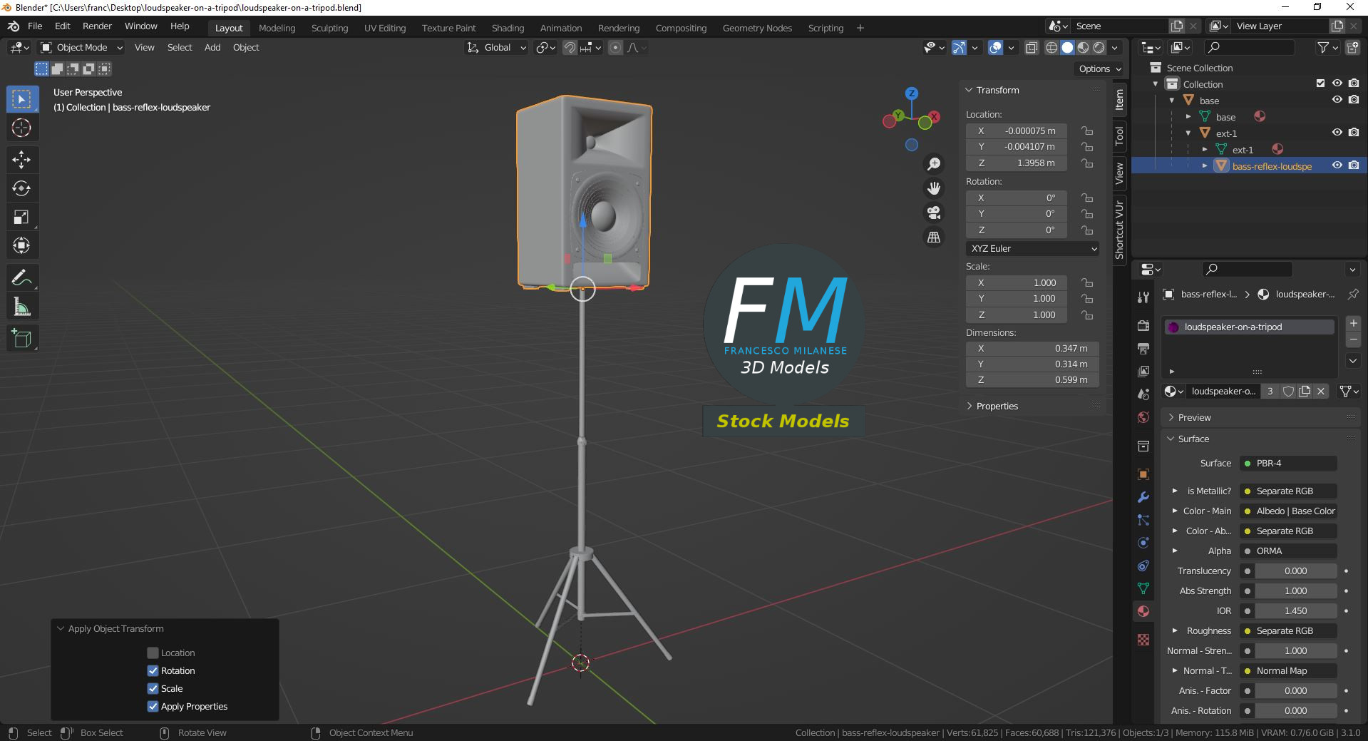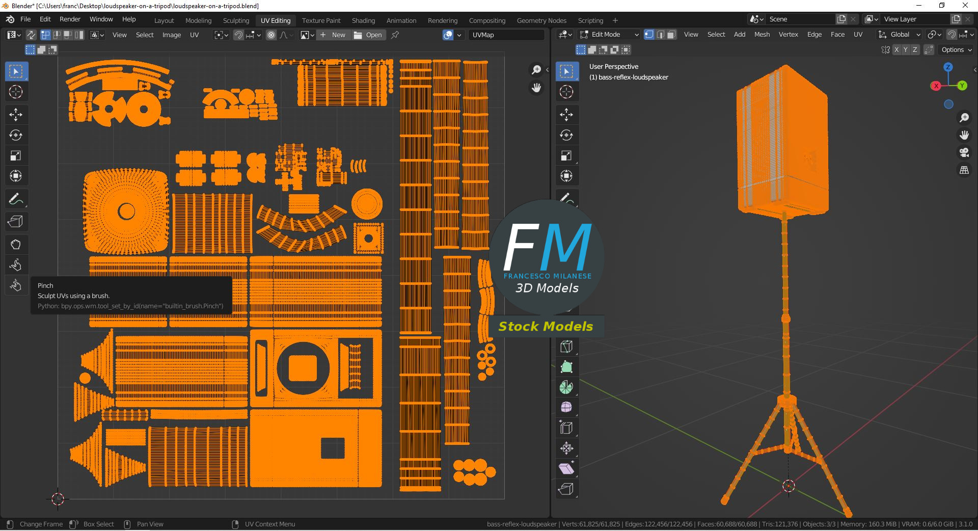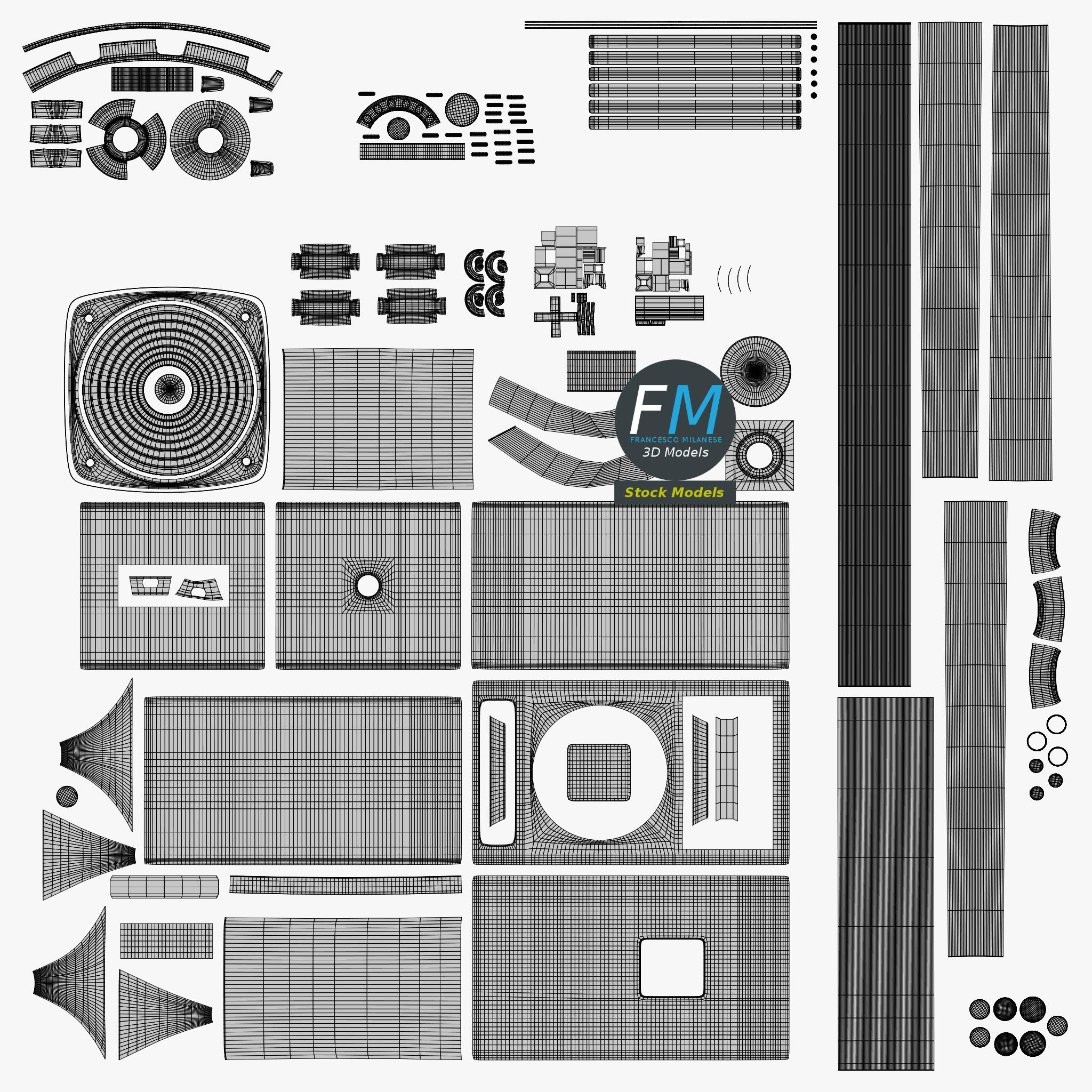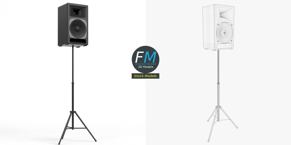 2-way bass reflex loudspeaker on an extendable tripod stand 3D Model. 3 individual objects (tripod base, tripod extension, loudspeaker), sharing the same non overlapping UV Layout map, Material and PBR Textures set. Production-ready 3D Model, with PBR materials, textures, non overlapping UV Layout map provided in the package.