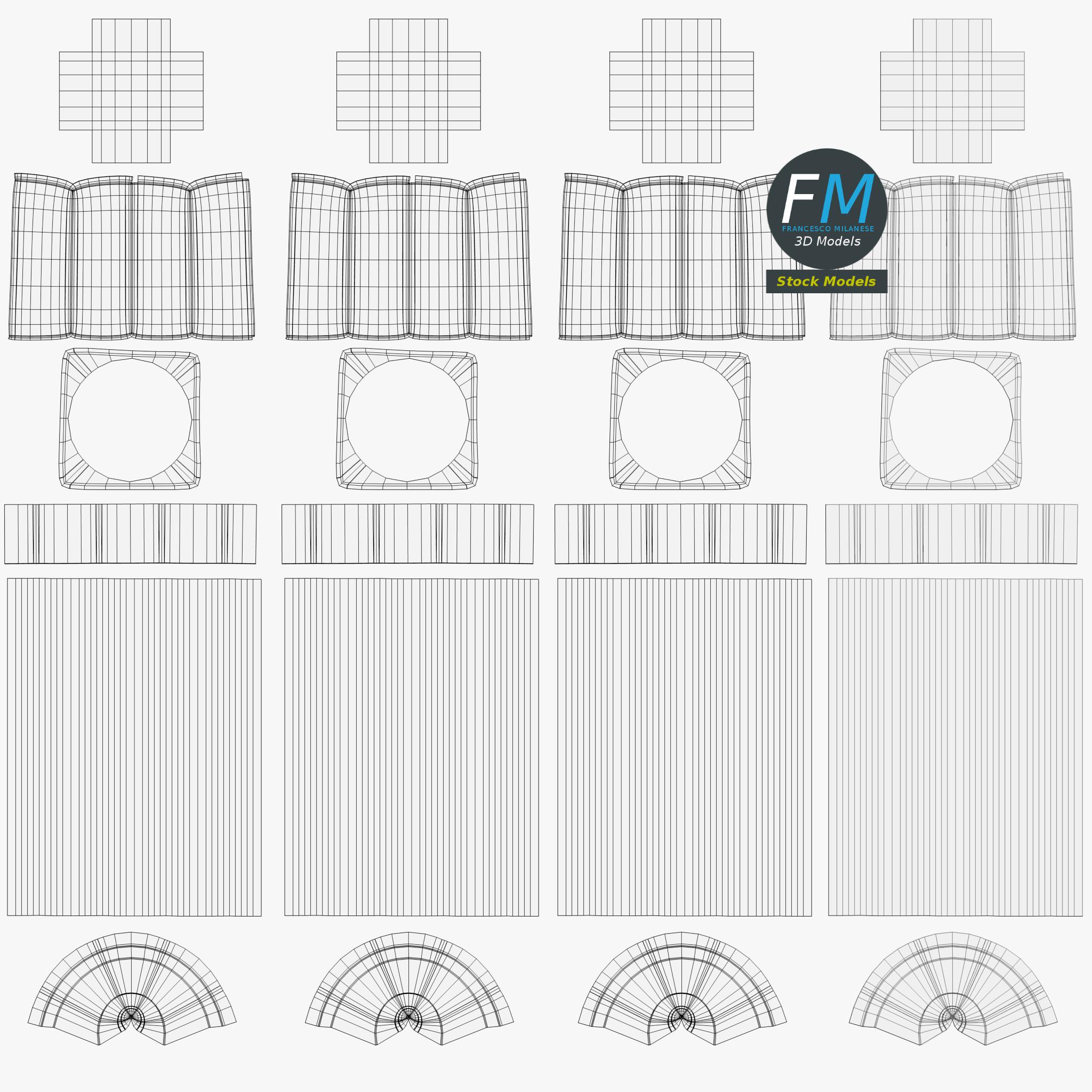 Easily customizable: UV unwrapped geometries, so you can create new Textures (or modify the existing ones) using the UV Layout maps provided in the package (as png with alpha).