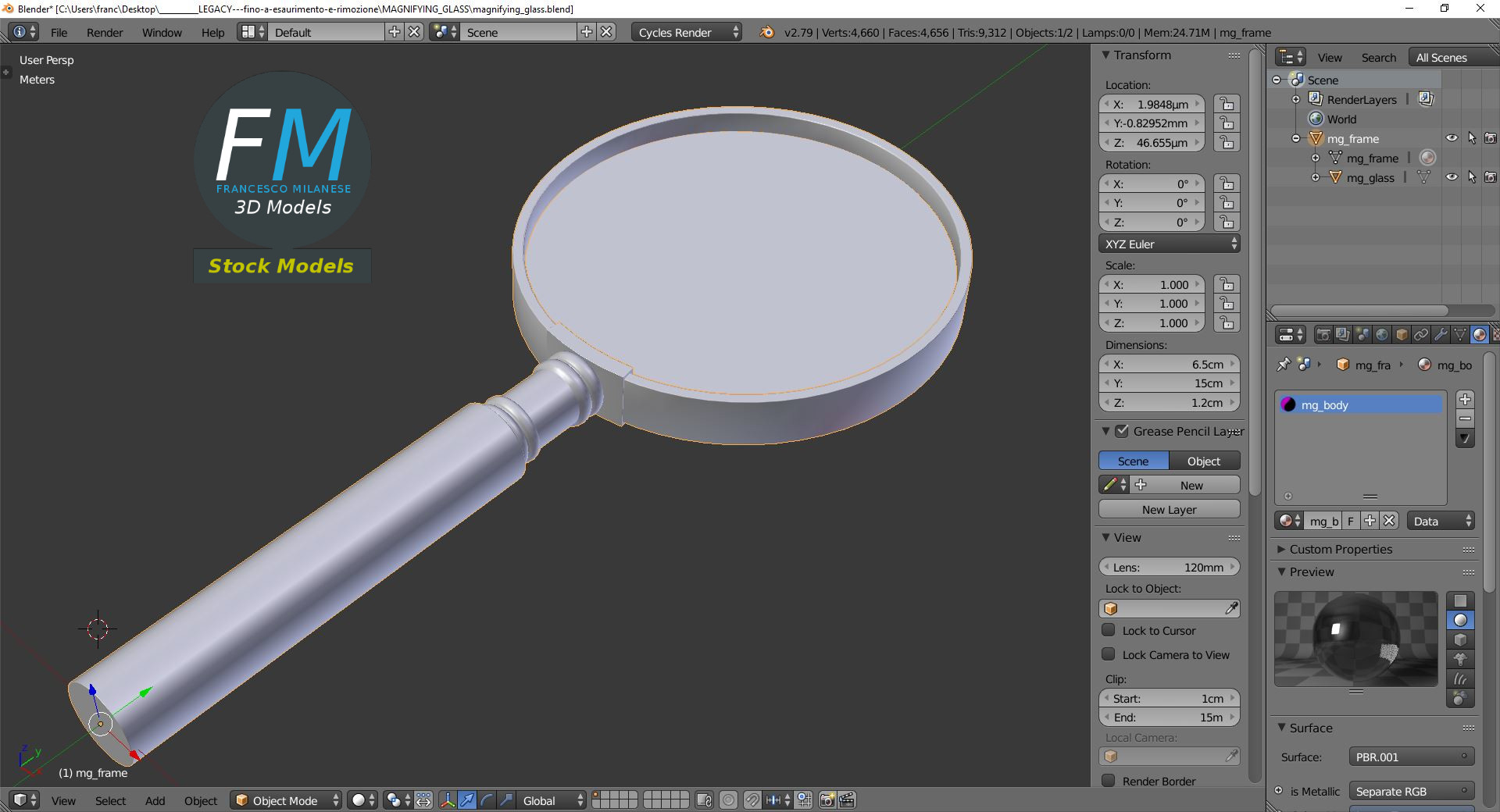 Magnifying glass 3D Model. 2 individual objects (frame, glass), each one with its own non overlapping UV Layout map, Material and PBR Textures set. Production-ready 3D Model, with PBR materials, textures, non overlapping UV Layout map provided in the package.