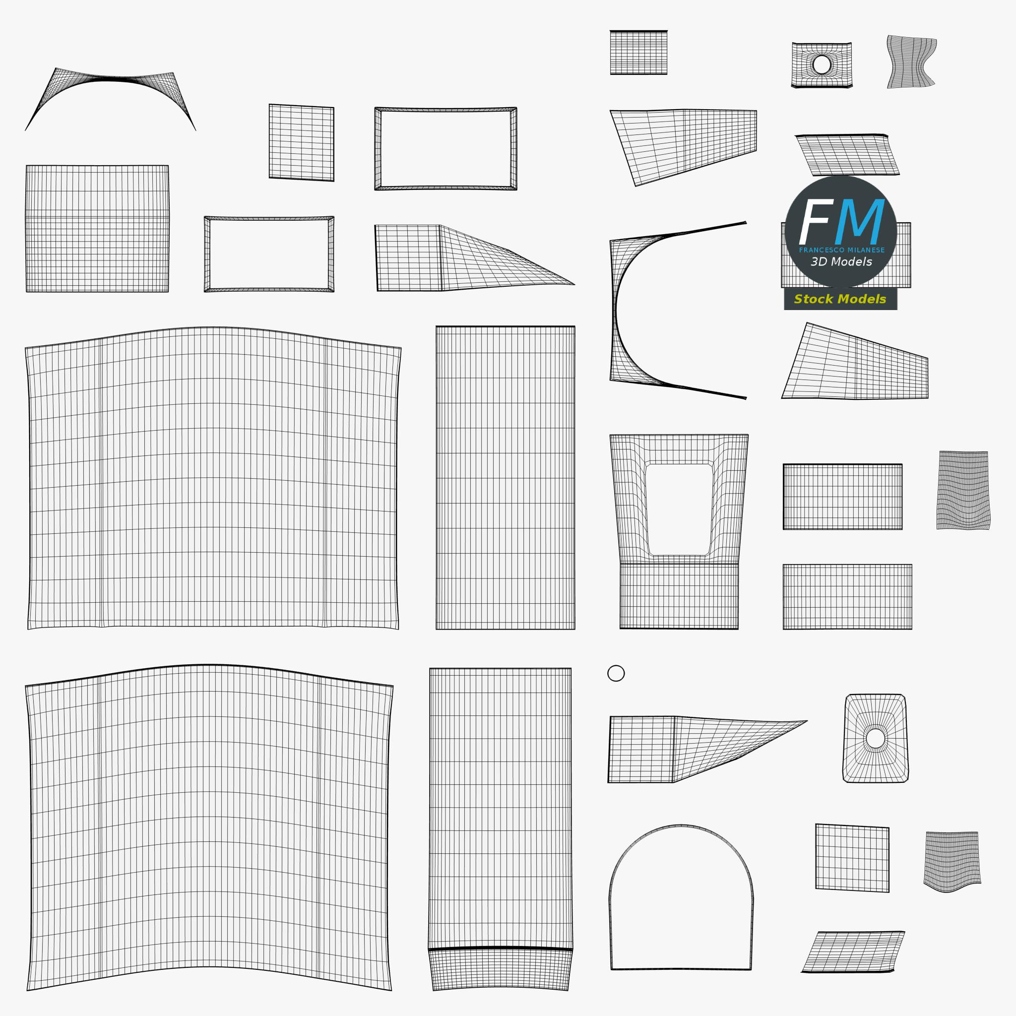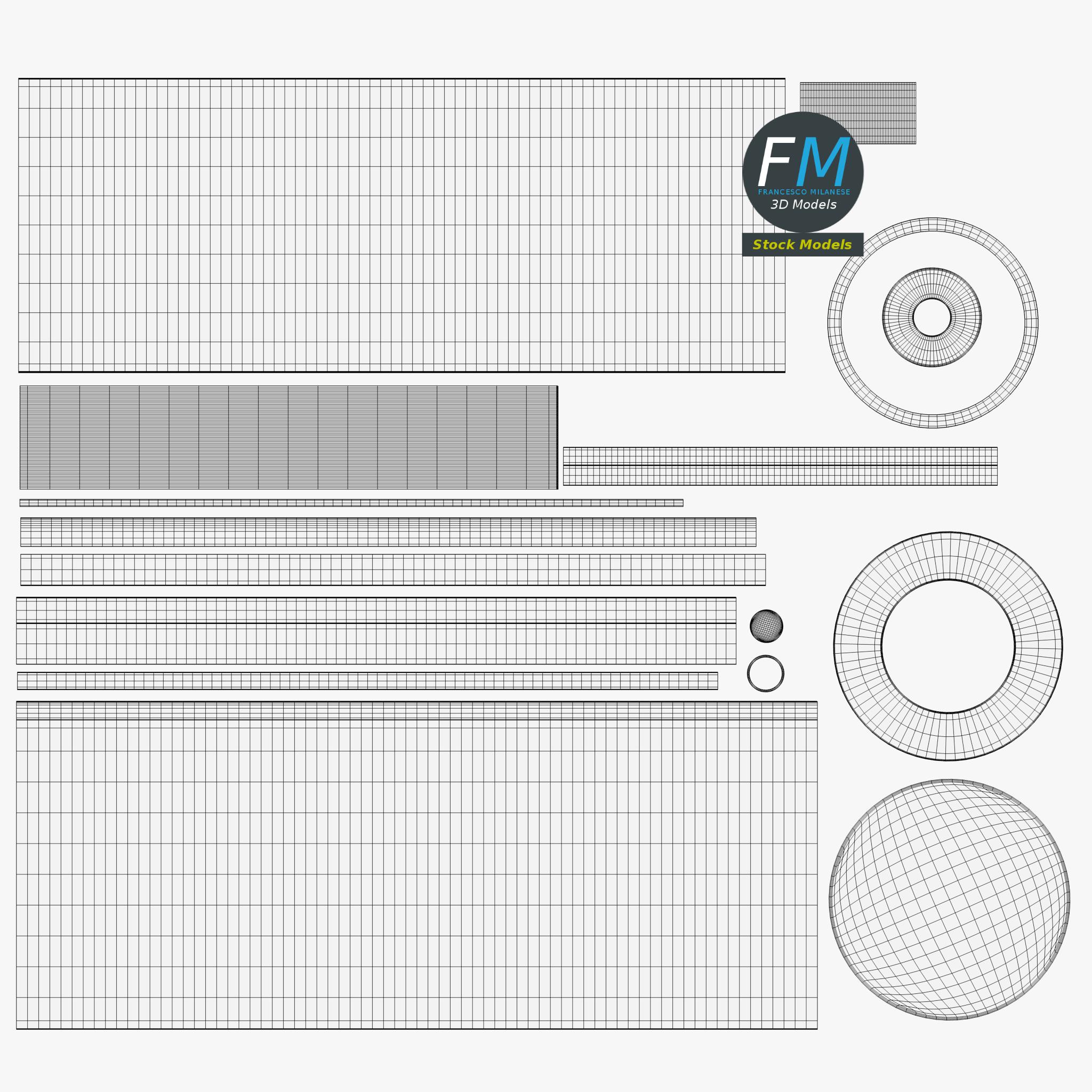 Easily customizable: UV unwrapped geometries, so you can create new Textures (or modify the existing ones) using the UV Layout maps provided in the package (as png with alpha).