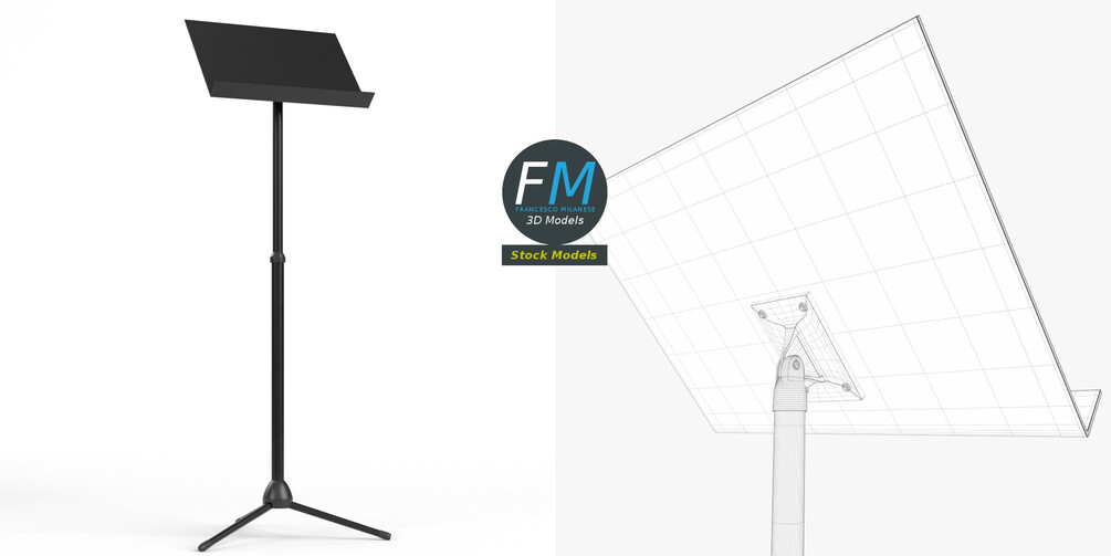 Music stand 3D Model, nr. 1 in my collection. 4 individual objects (tripod base, tripod extension, tripod rotating top, stand; so, you can easily edit or even animate it), sharing the same non overlapping UV Layout map, Material and PBR Textures set. Production-ready 3D Model, with PBR materials, textures, non overlapping UV Layout map provided in the package.