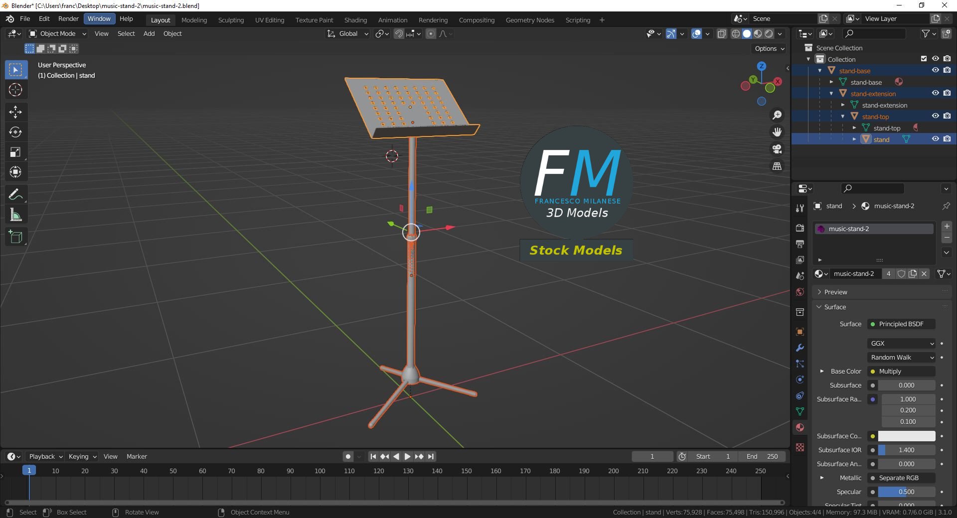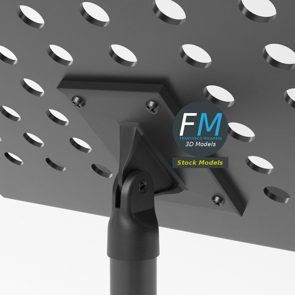 Music stand 3D Model, nr. 2 in my collection. 4 individual objects (tripod base, tripod extension, tripod rotating top, stand; so, you can easily edit or even animate it), sharing the same non overlapping UV Layout map, Material and PBR Textures set. Production-ready 3D Model, with PBR materials, textures, non overlapping UV Layout map provided in the package.