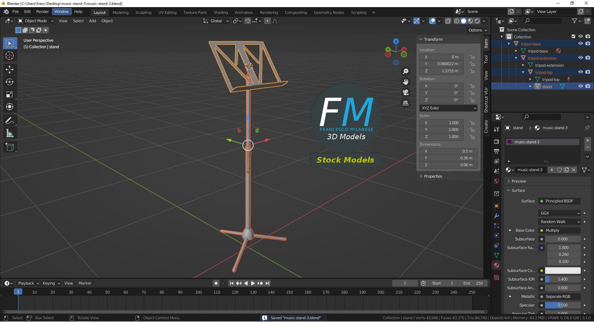 Music stand 3D Model, nr. 3 in my collection. 4 individual objects (tripod base, tripod extension, tripod rotating top, stand; so, you can easily edit or even animate it), sharing the same non overlapping UV Layout map, Material and PBR Textures set. Production-ready 3D Model, with PBR materials, textures, non overlapping UV Layout map provided in the package.