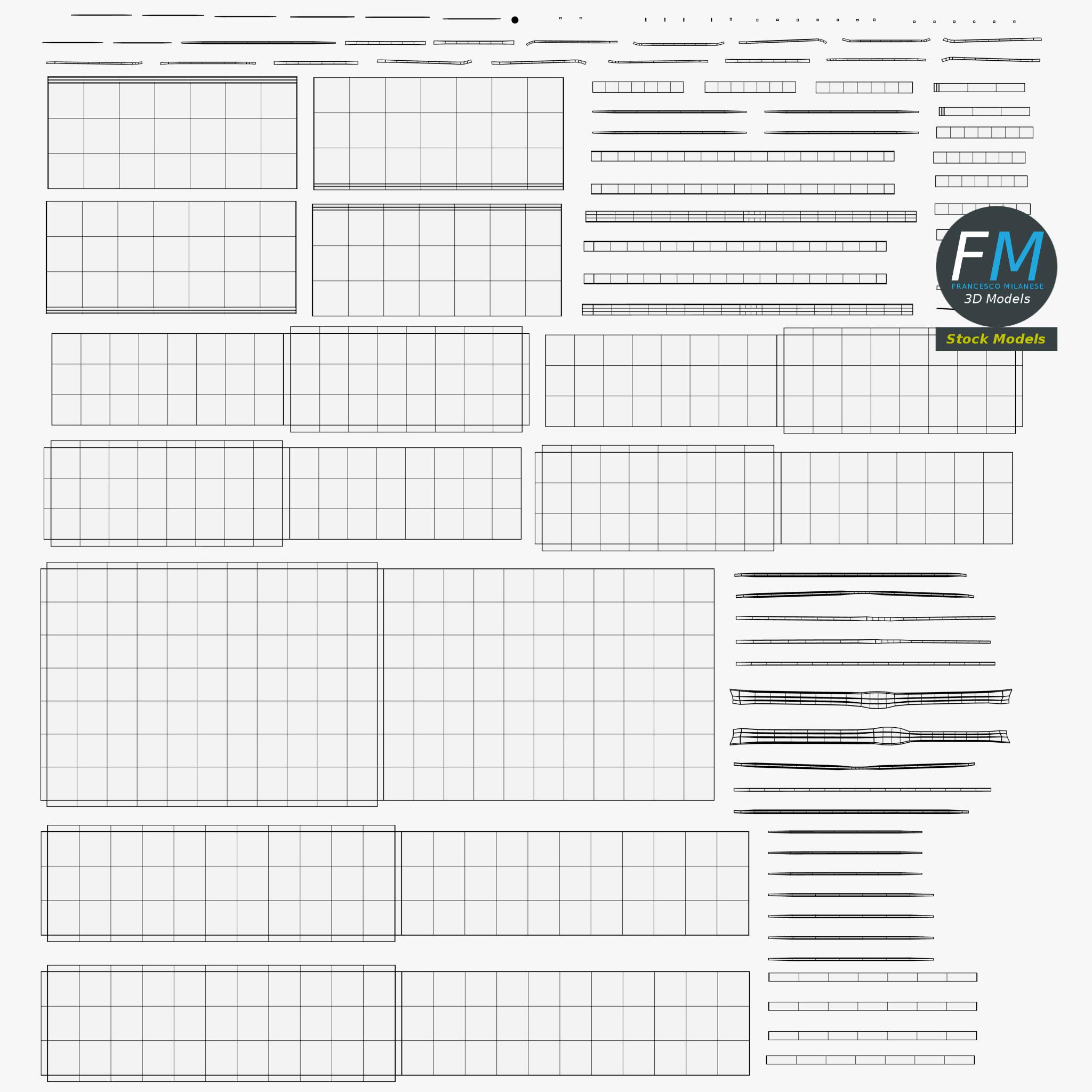 Easily customizable: UV unwrapped geometries, so you can create new Textures (or modify the existing ones) using the UV Layout maps provided in the package (as png with alpha).