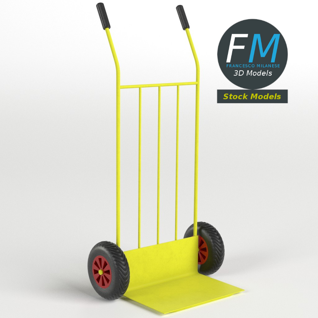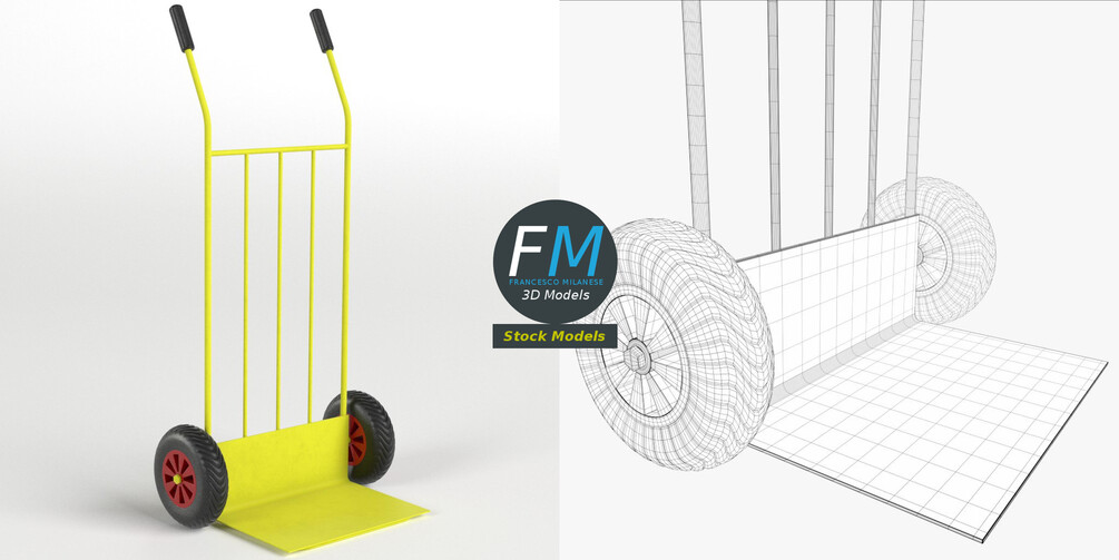 Parcel trolley sack truck 3D Model. 2 individual objects (frame, wheels; so, you can easily rotate or even animate it), sharing the same non overlapping UV Layout map, Material and PBR Textures set. Production-ready 3D Model, with PBR materials, textures, non overlapping UV Layout map provided in the package.
