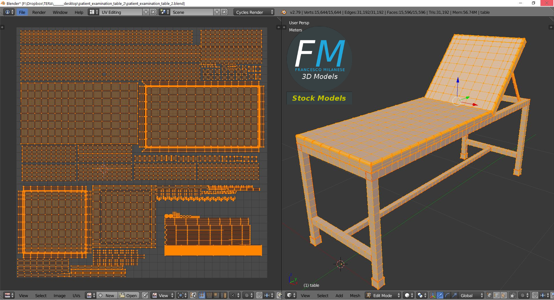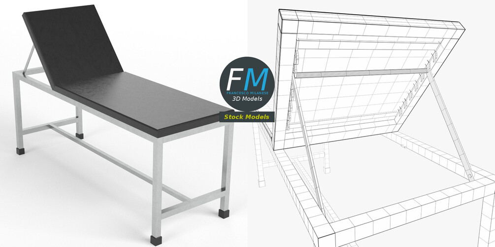 Patient examination table 3D Model, nr. 2 in my collection. 3 individual objects (table, back, rods; so, you can rotate or even animate them) sharing the same non overlapping UV Layout map, Material and PBR Textures set. Production-ready 3D Model, with PBR materials, textures, non overlapping UV Layout map provided in the package.