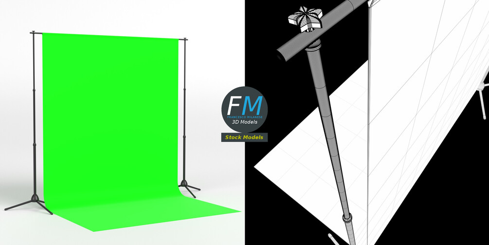 Photography backdrop 3D Model. 4 objects (2 tripods, 1 bar, 1 backdrop canvas), sharing 2 non overlapping UV Layout maps, Materials (rig, backdrop) and PBR Textures sets. Production-ready 3D Model, with PBR materials, textures, non overlapping UV Layout map provided in the package.