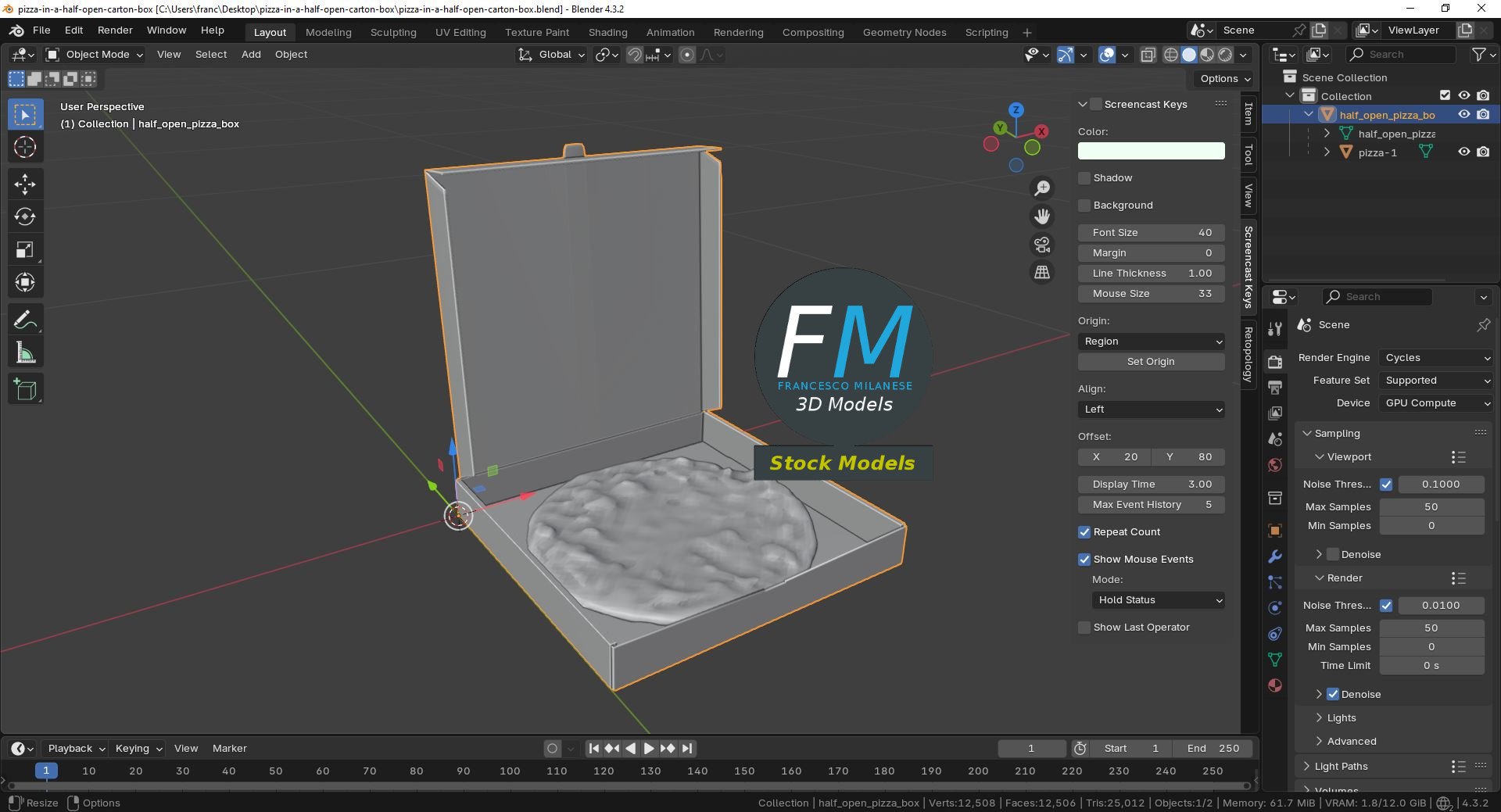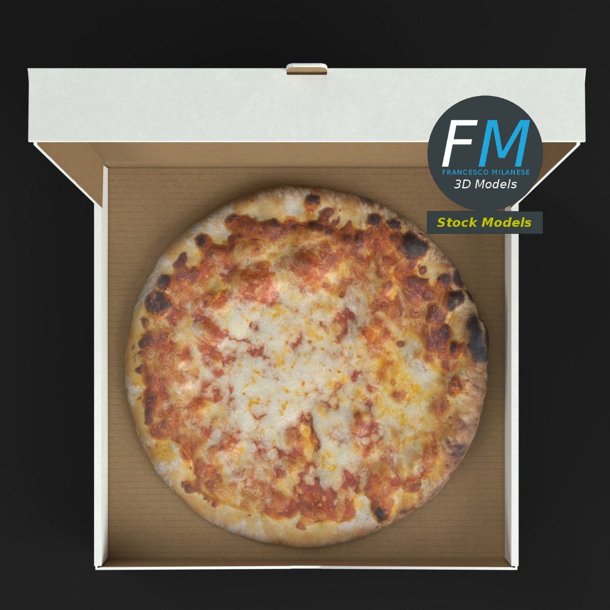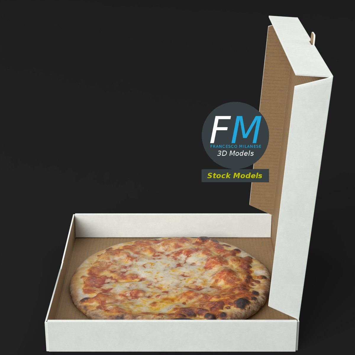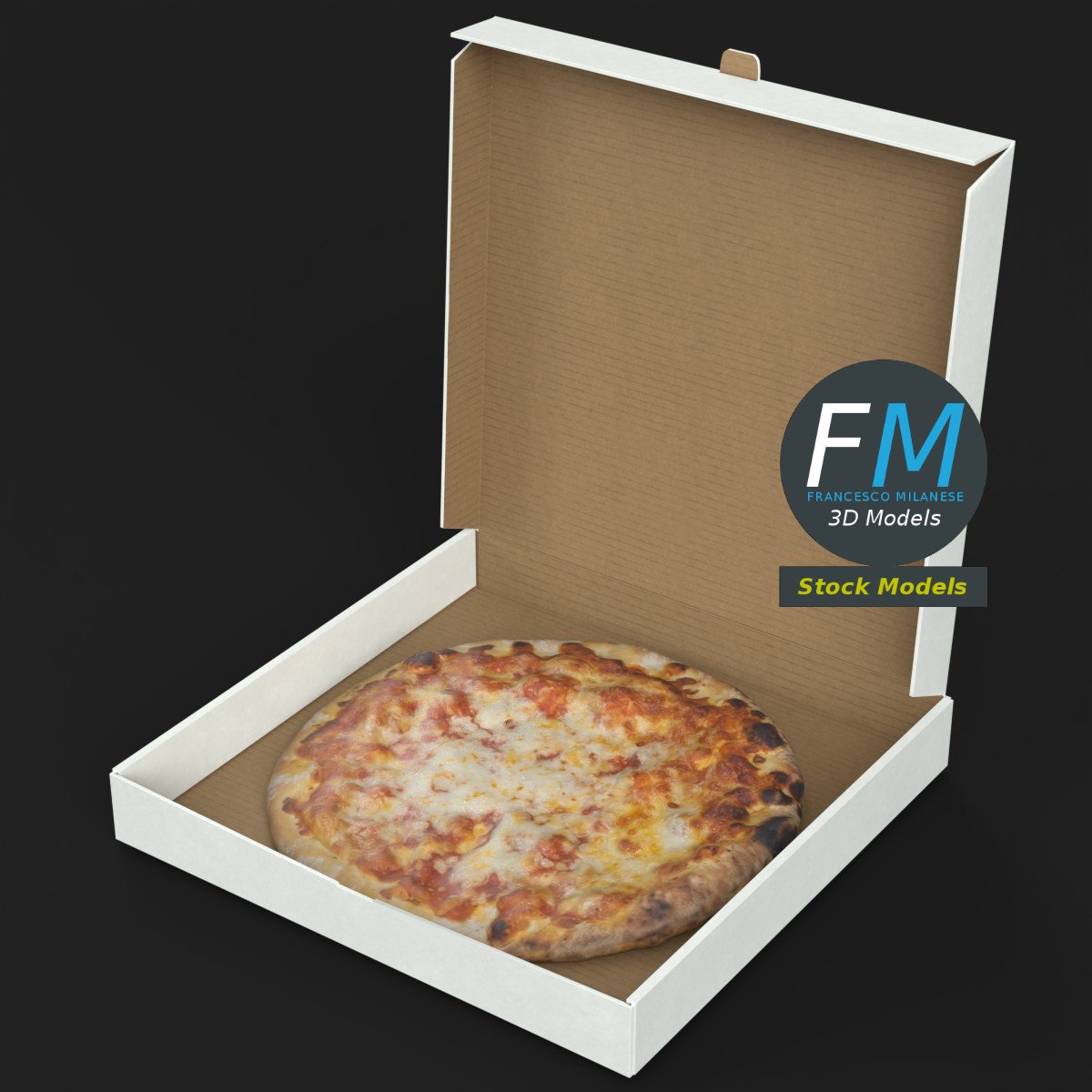 Pizza in a half open carton box 3D Model. 2 individual objects (pizza, carton box), each one with its own non overlapping UV Layout map, Material and PBR Textures set. Production-ready 3D Model, with PBR materials, textures, non overlapping UV Layout map provided in the package.