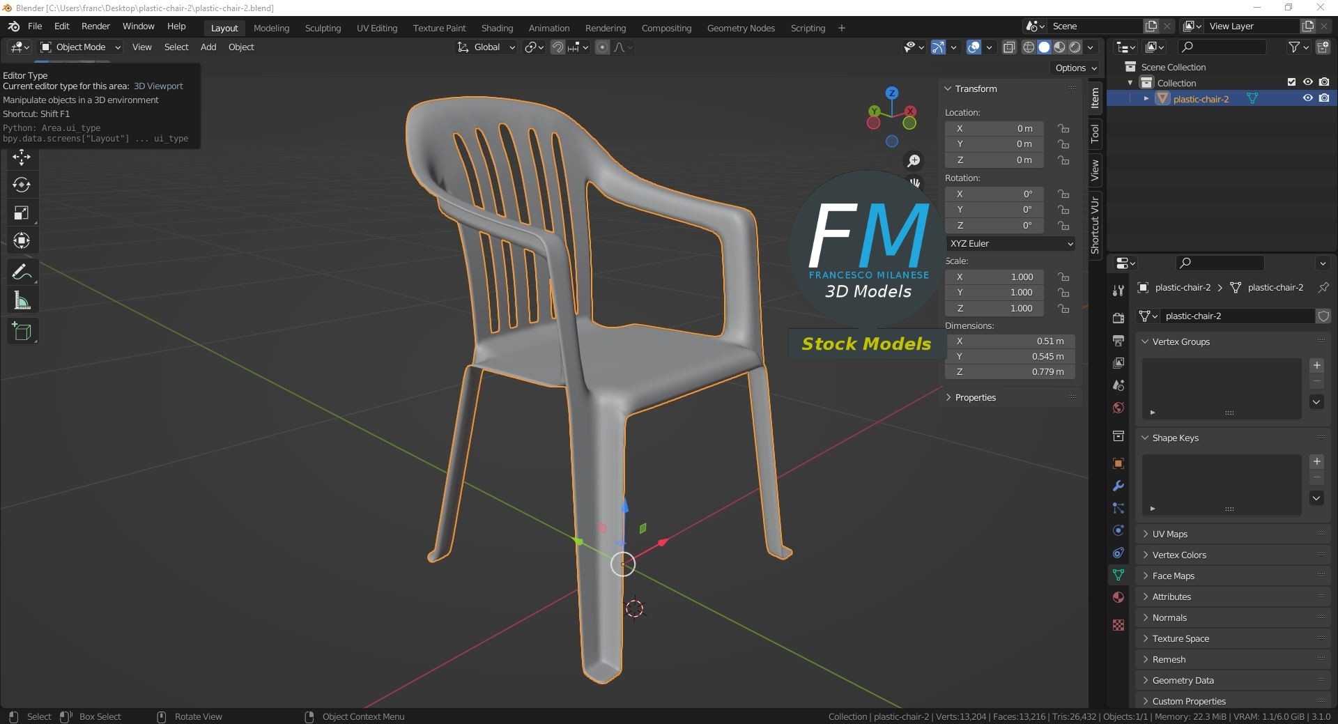 Plastic chair 3D Model, nr. 2 in my collection. Production-ready 3D Model, with PBR materials, textures, non overlapping UV Layout map provided in the package.