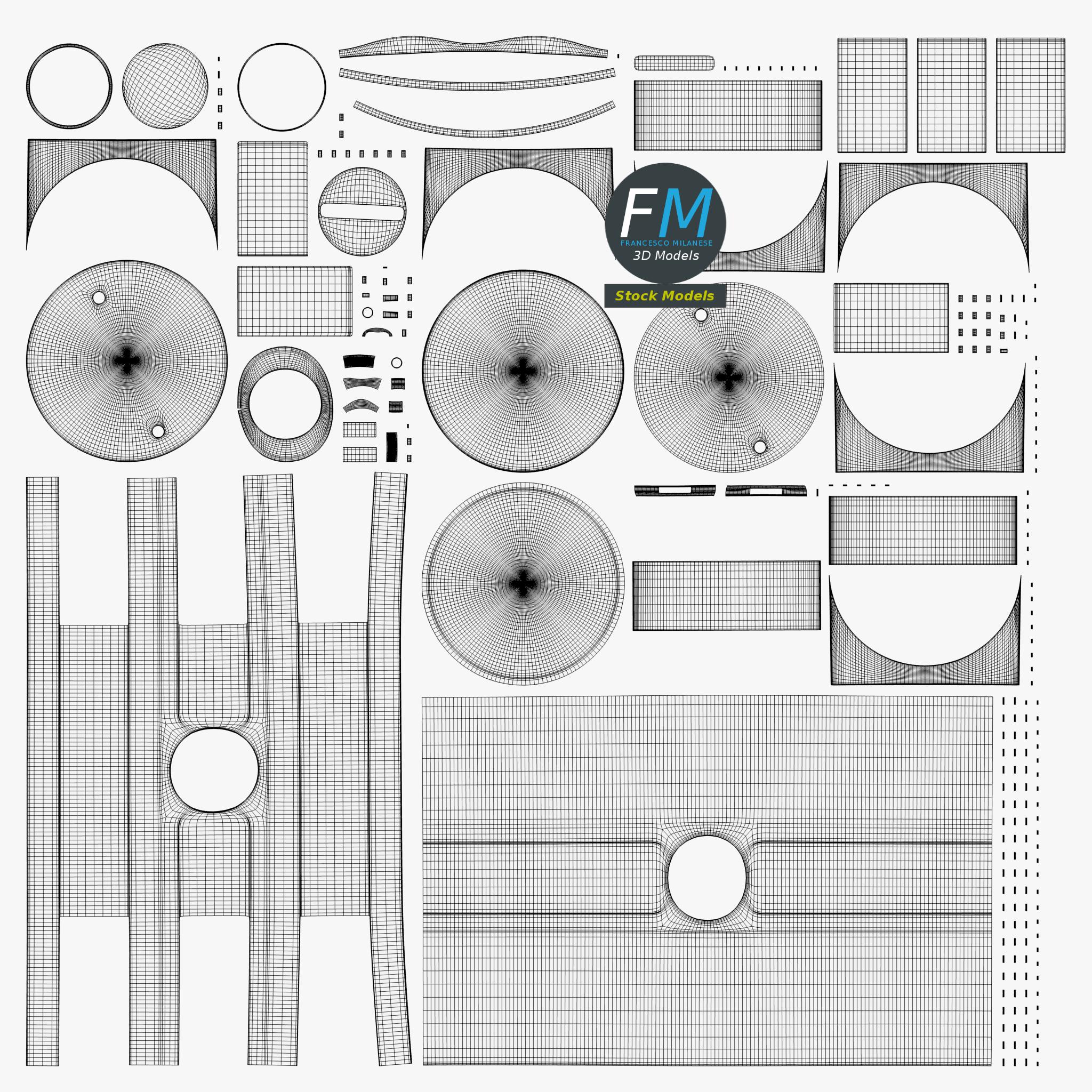 Easily customizable: UV unwrapped geometries, so you can create new Textures (or modify the existing ones) using the UV Layout maps provided in the package (as png with alpha).