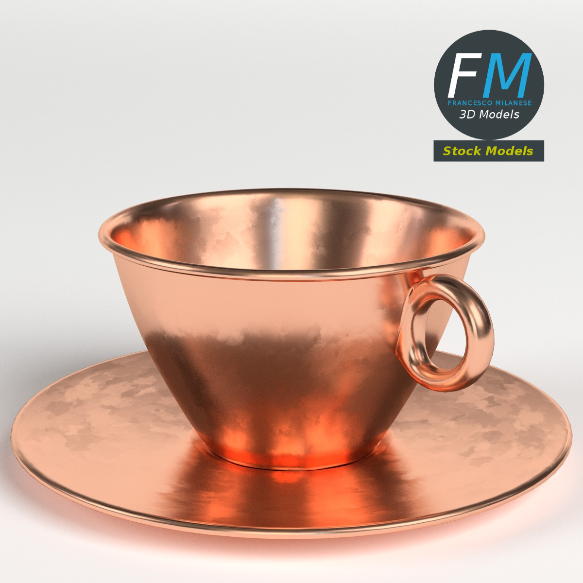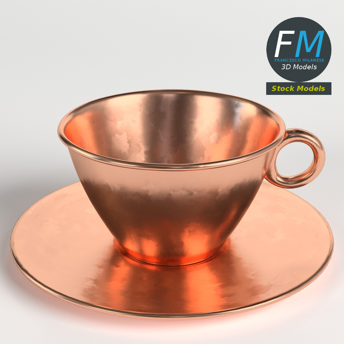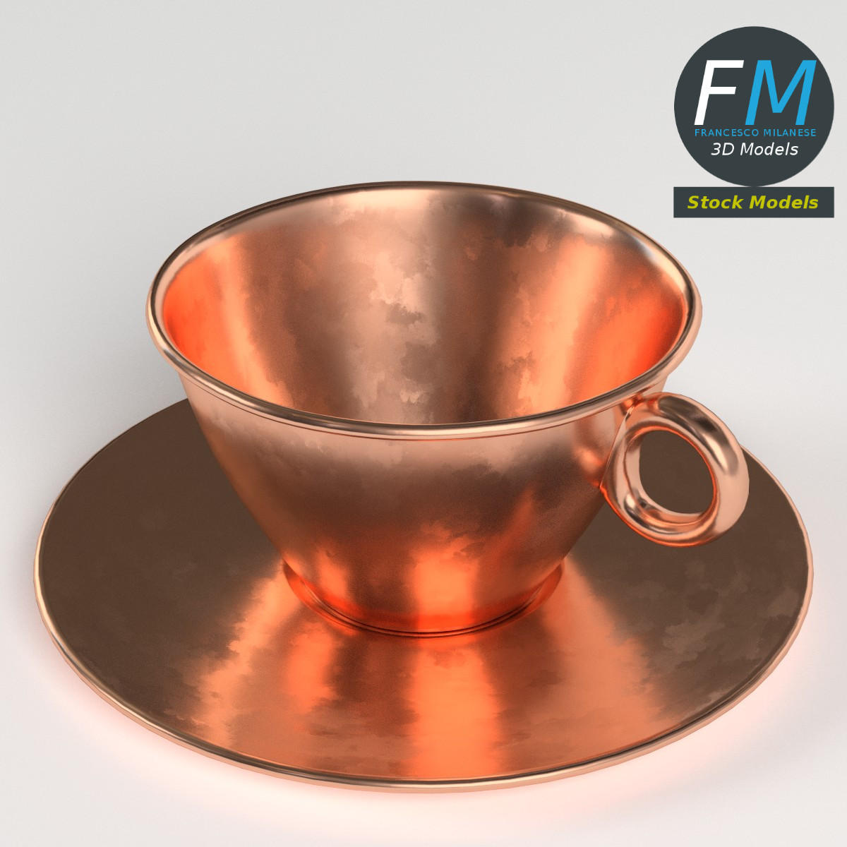 Pure copper tea cup 3D Model. 2 objects (saucer, tea cup), parented, each one with its own non overlapping UV Layout map, Material and PBR Textures set. Production-ready 3D Model, with PBR materials, textures, non overlapping UV Layout map provided in the package.