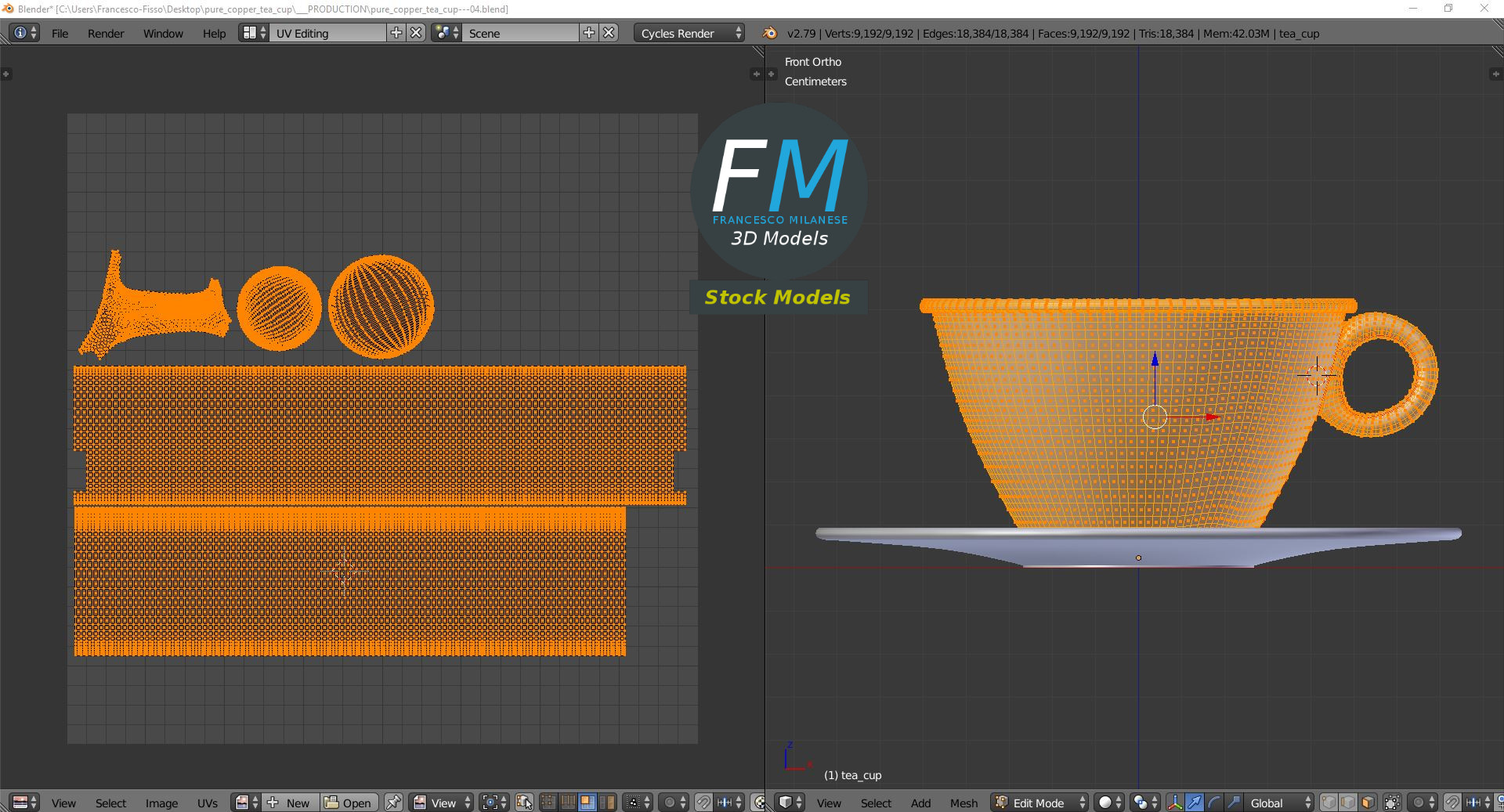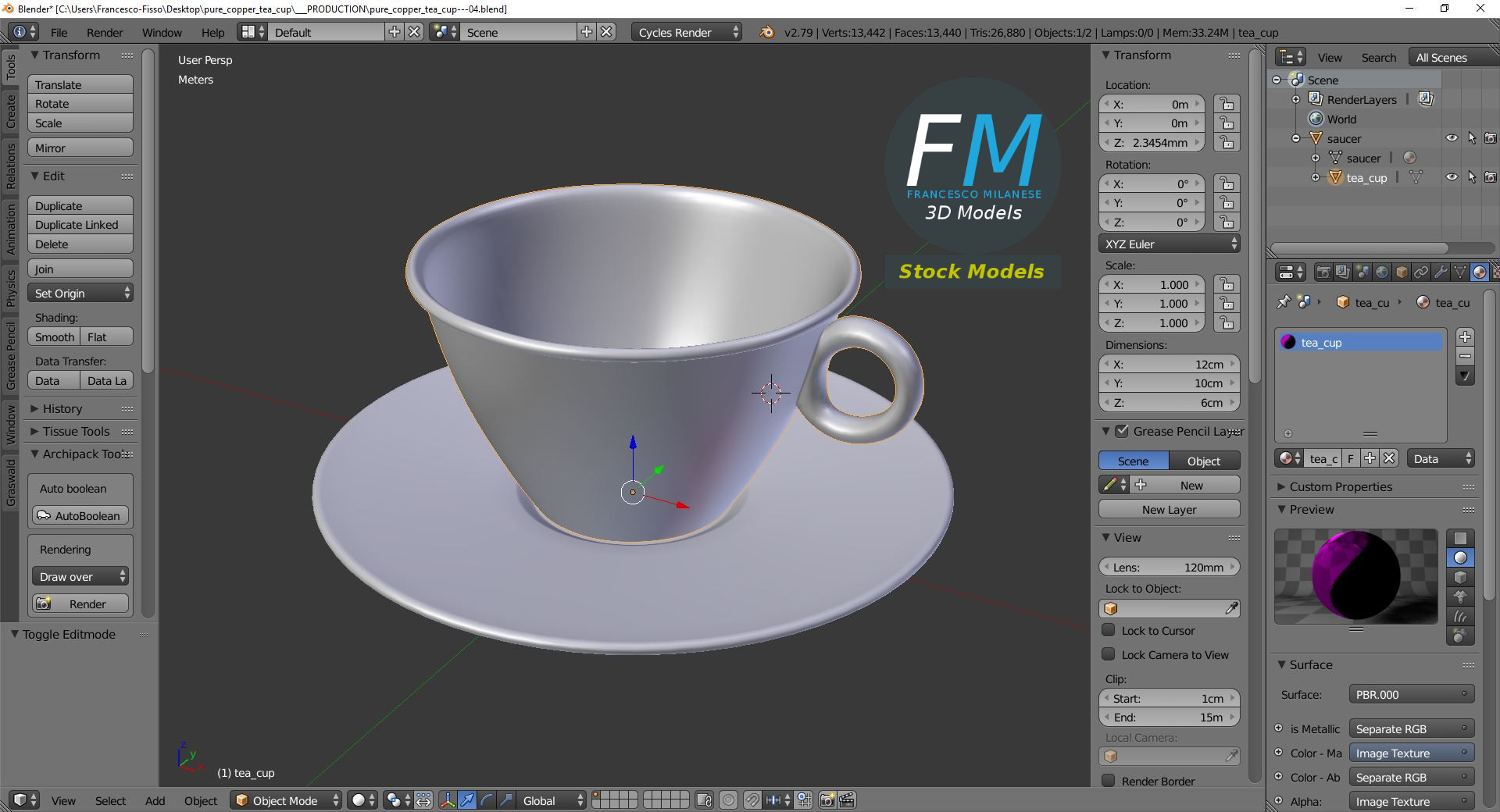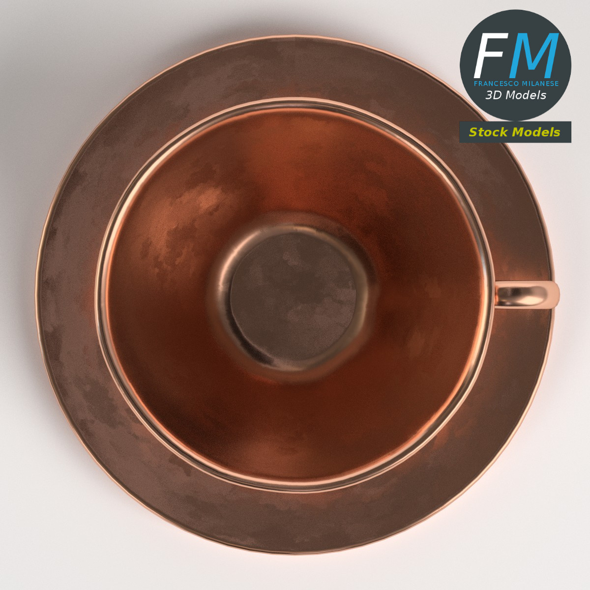 Pure copper tea cup 3D Model. 2 objects (saucer, tea cup), parented, each one with its own non overlapping UV Layout map, Material and PBR Textures set. Production-ready 3D Model, with PBR materials, textures, non overlapping UV Layout map provided in the package.