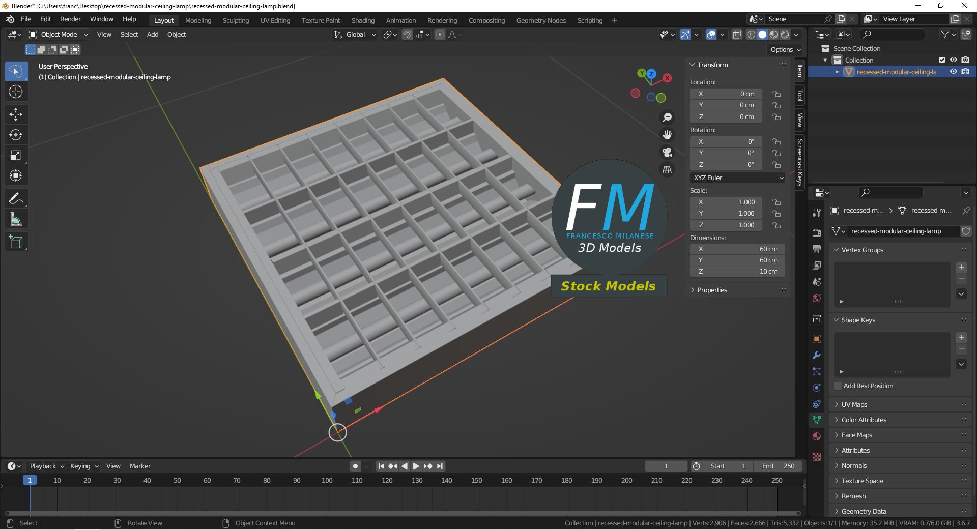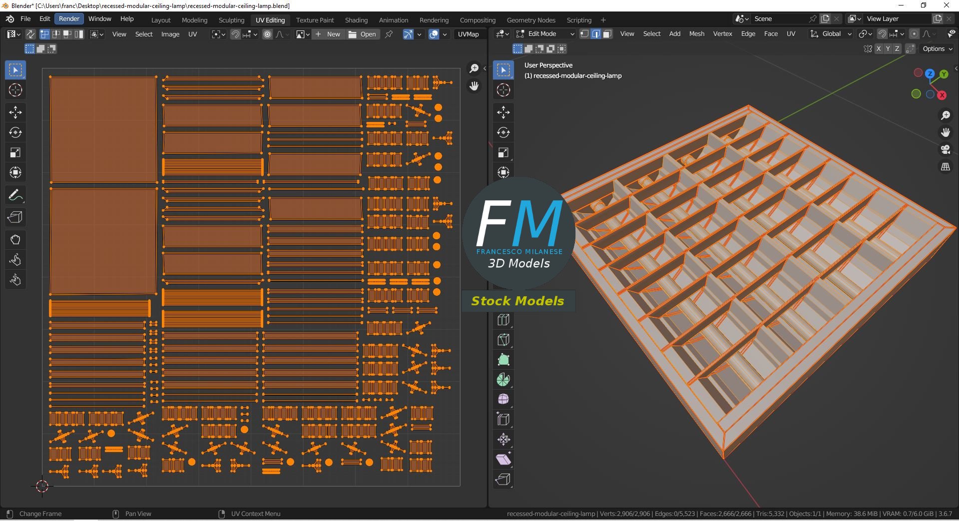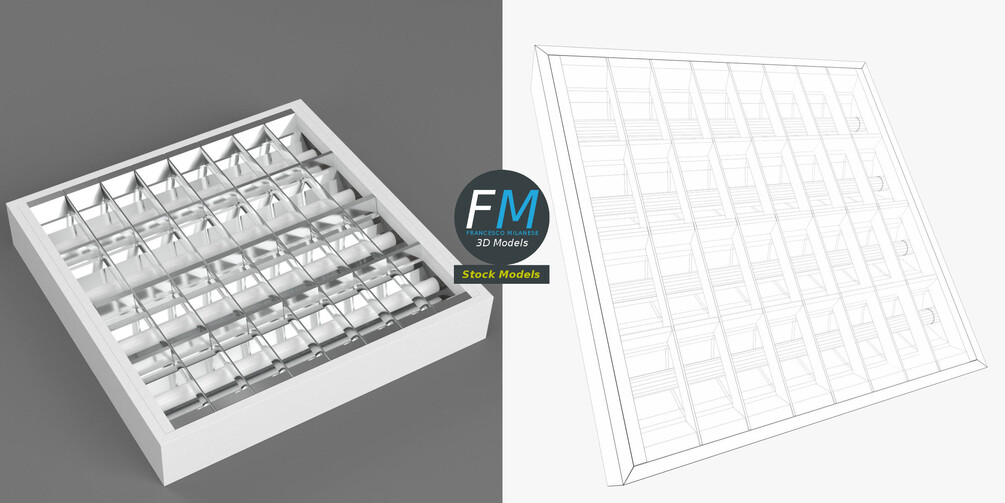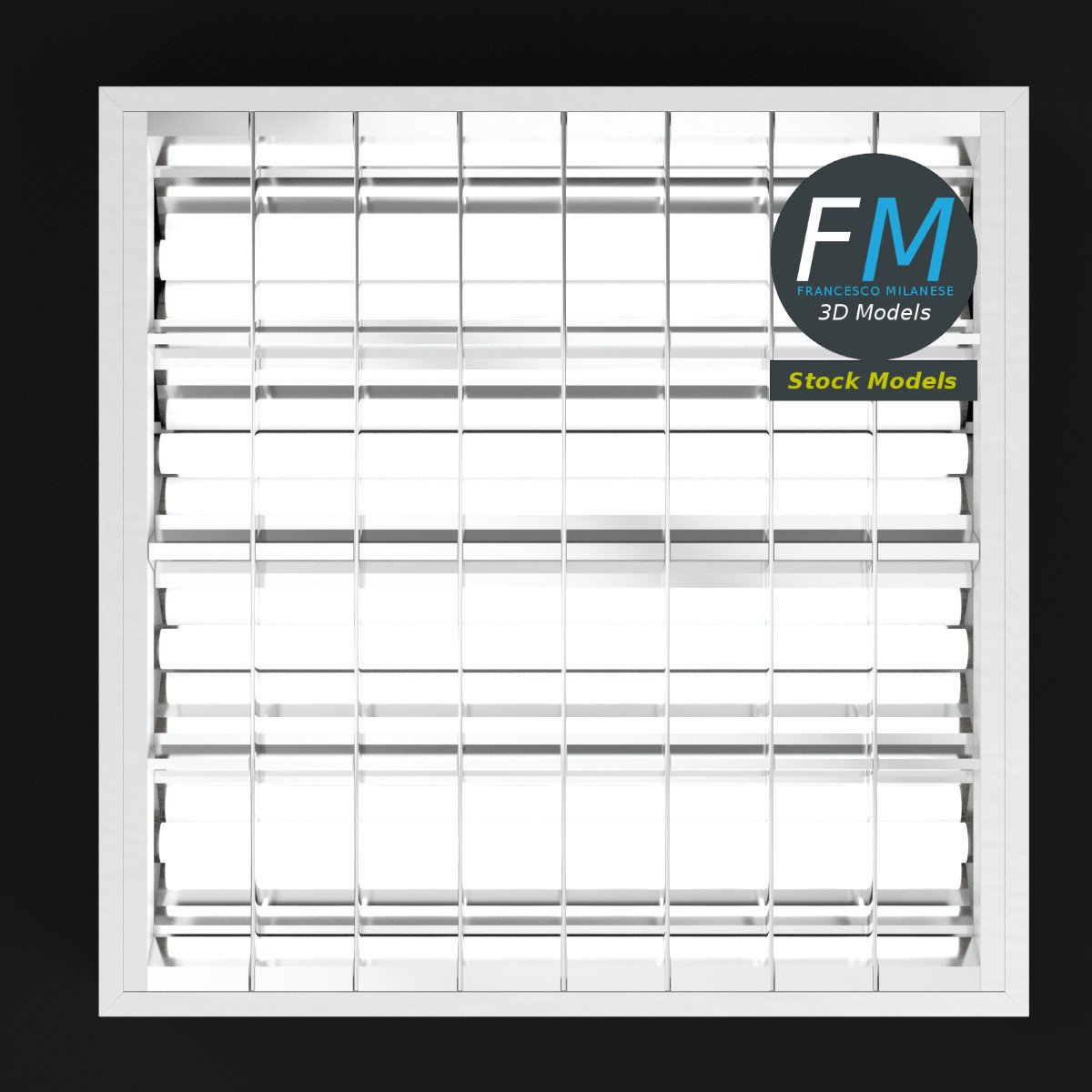 Recessed modular troffer ceiling lamp 3D Model, square version. 1 Objects, 2 Materials (frame, tubes), sharing the same non overlapping UV Layout map. Production-ready 3D Model, with PBR materials, textures, non overlapping UV Layout map provided in the package.