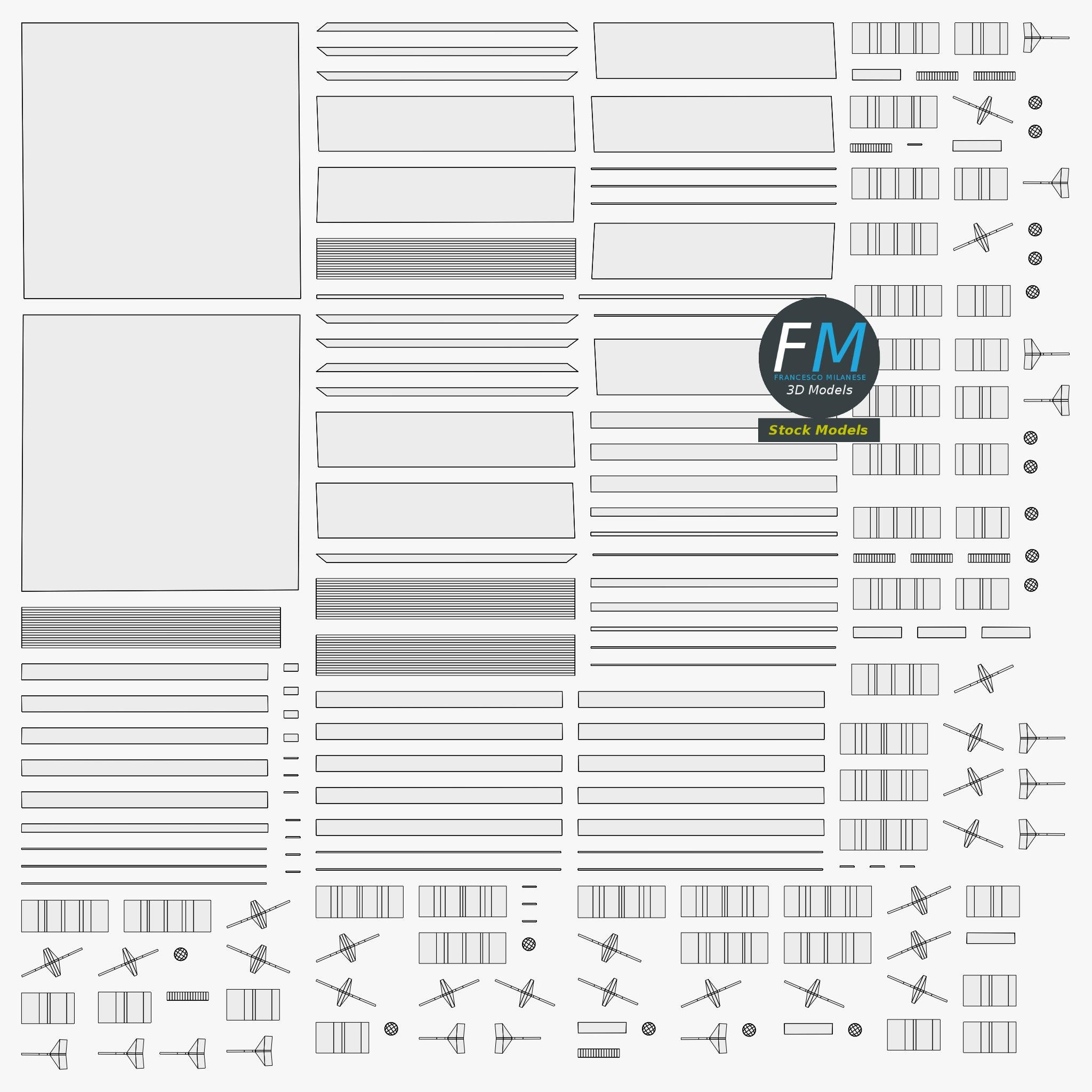 Easily customizable: UV unwrapped geometries; UV Layout maps provided in the package as png with alpha images.