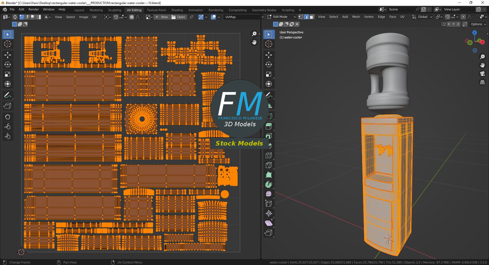 Rectangular water cooler 3D Model. 2 individual objects (jug, water cooler), each one with its own non overlapping UV Layout map, Material and PBR Textures set. Production-ready 3D Model, with PBR materials, textures, non overlapping UV Layout map provided in the package.