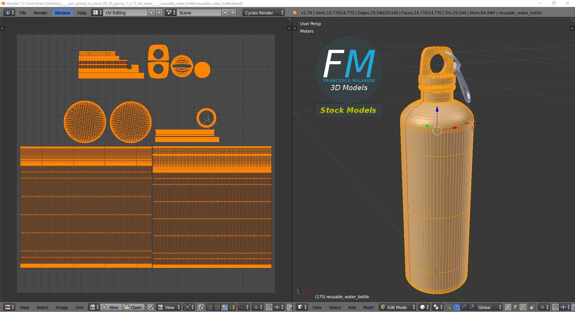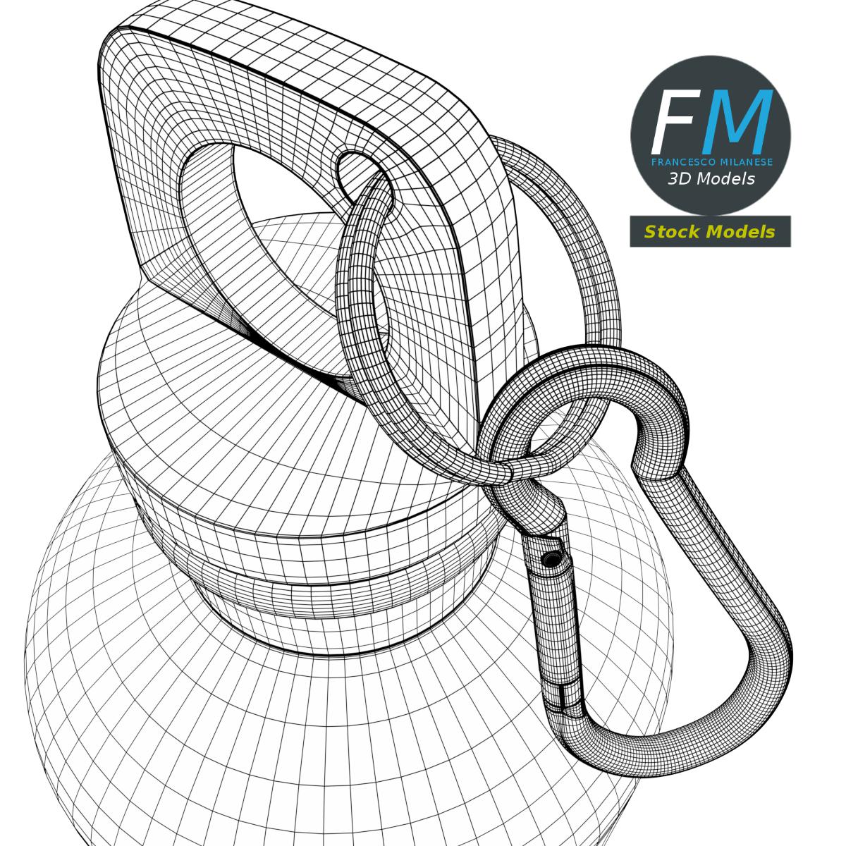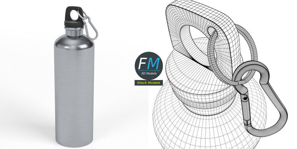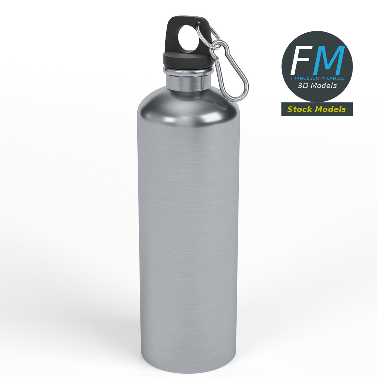 Reusable water bottle 3D Model, perfect for an advertising template or mock-up. 3 individual objects (bottle; carabiner; split ring), each one with its own non overlapping UV Production-ready 3D Model, with PBR materials, textures, non overlapping UV Layout map provided in the package.