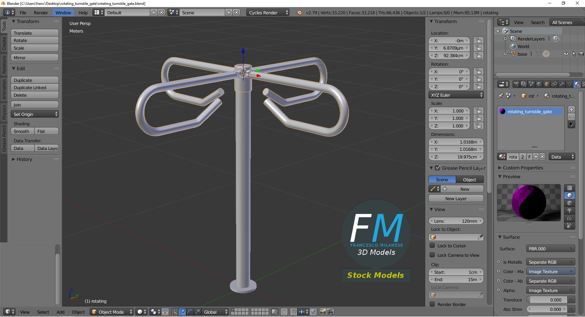 Rotating turnstile gate 3D Model. 2 individual objects (base, rotating part; so, you can easily rotate or even animate it) sharing the same non overlapping UV Layout map, Material and PBR Textures set. Production-ready 3D Model, with PBR materials, textures, non overlapping UV Layout map provided in the package.