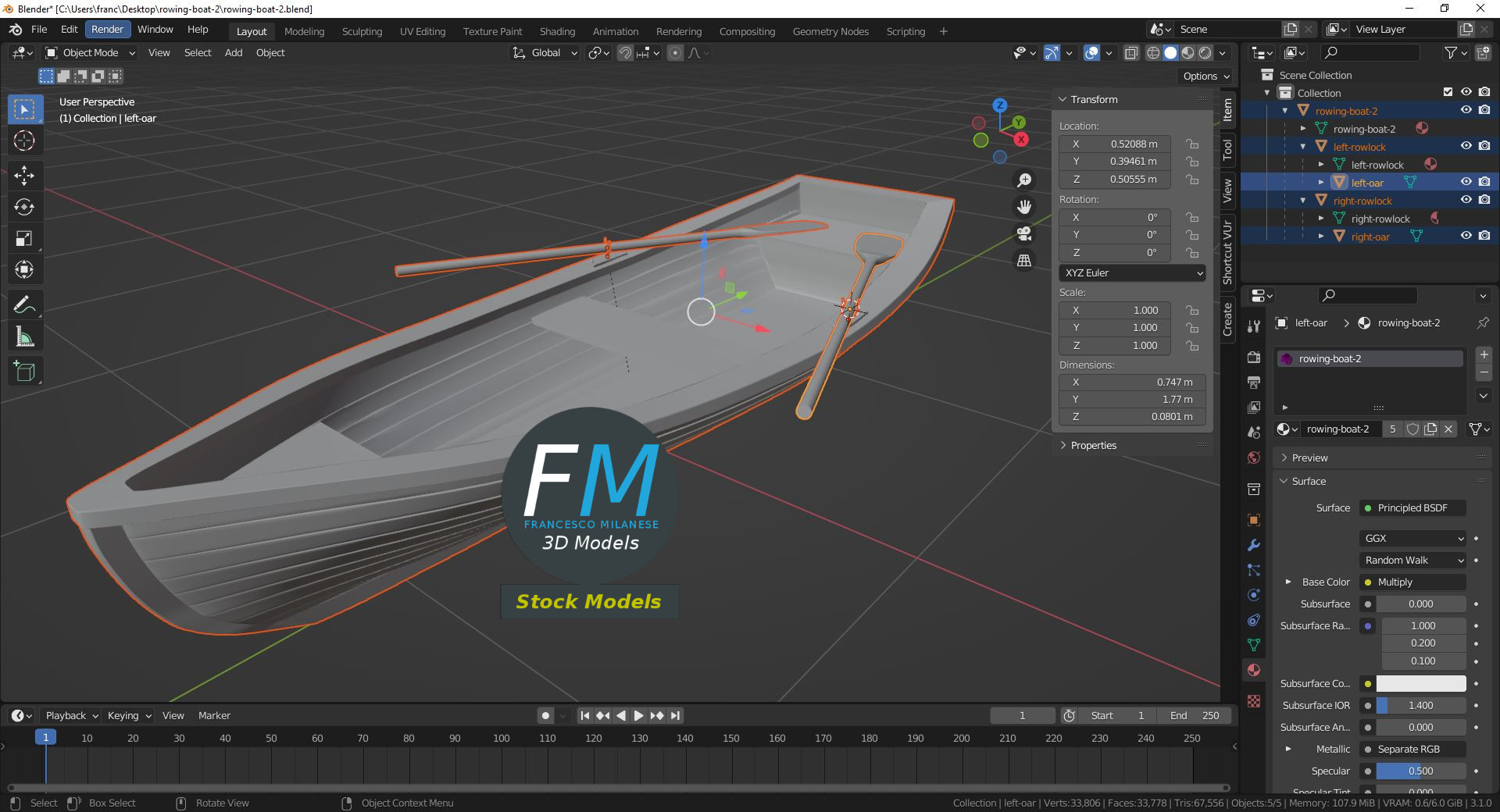 Rowing boat 3D Model, nr. 2 in my collection. 5 individual objects (boat, 2 rowlocks, 2 oars; so, you can easily rotate or even animate the rowlocks and the oars), sharing the same non overlapping UV Layout map, Material and PBR Textures set. Production-ready 3D Model, with PBR materials, textures, non overlapping UV Layout map provided in the package.
