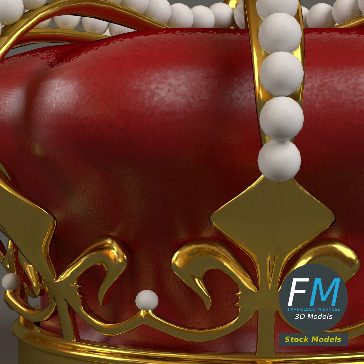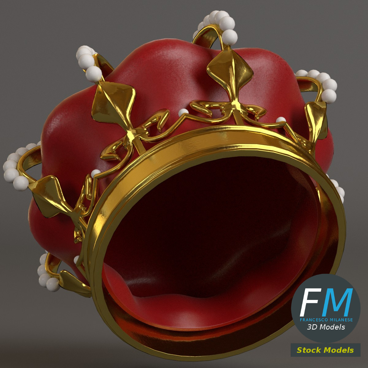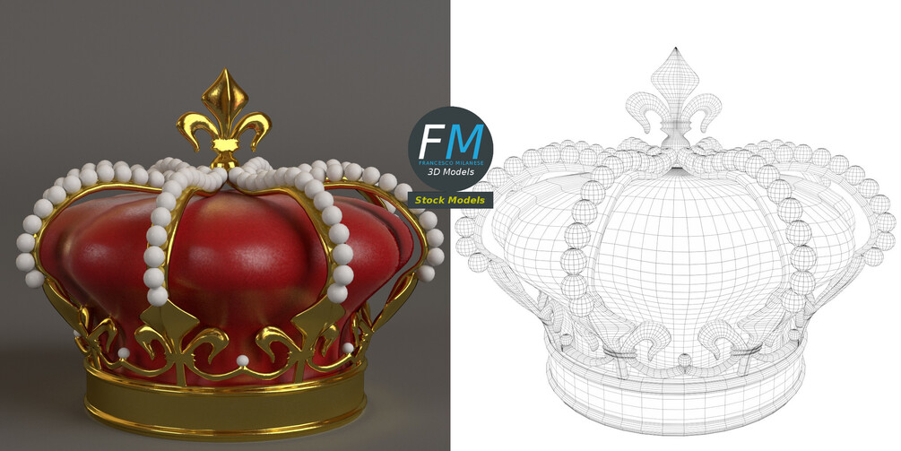 Royal crown 3D Model. 3 objects (frame, pearls, velvet --- so you can remove the pearls, for example), each one with its own non overlapping UV Layout map, Material and PBR Textures set. Production-ready 3D Model, with PBR materials, textures, non overlapping UV Layout map provided in the package.