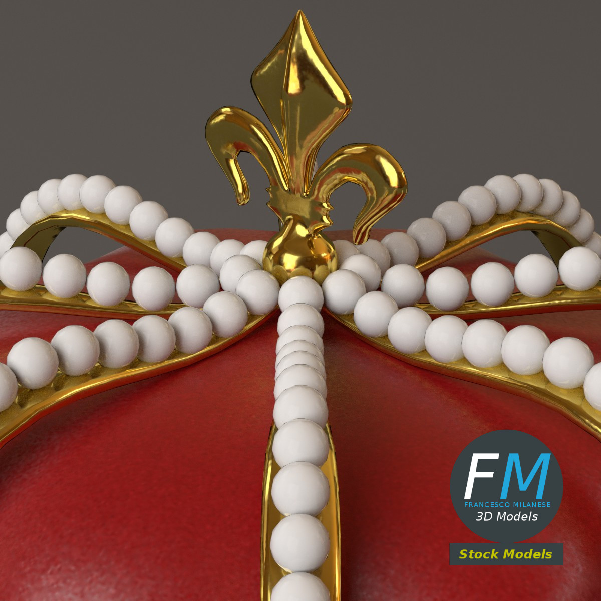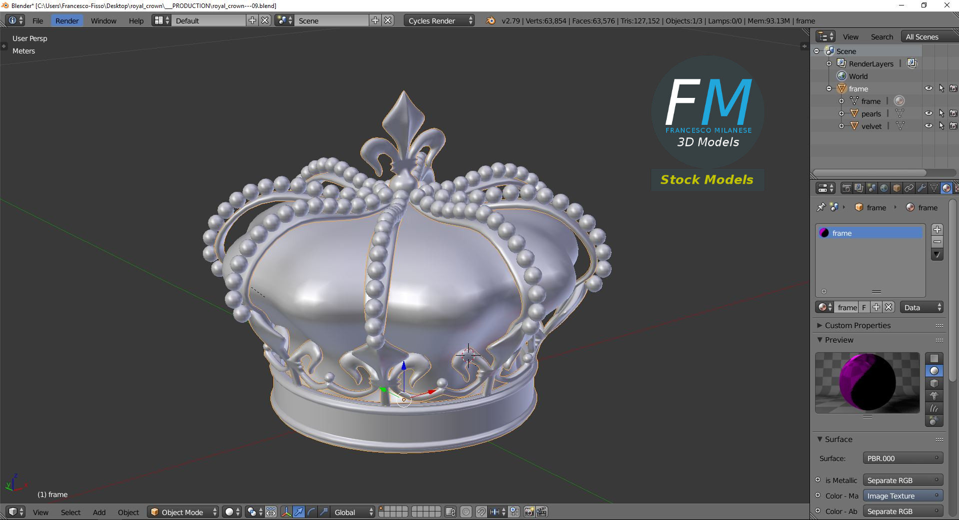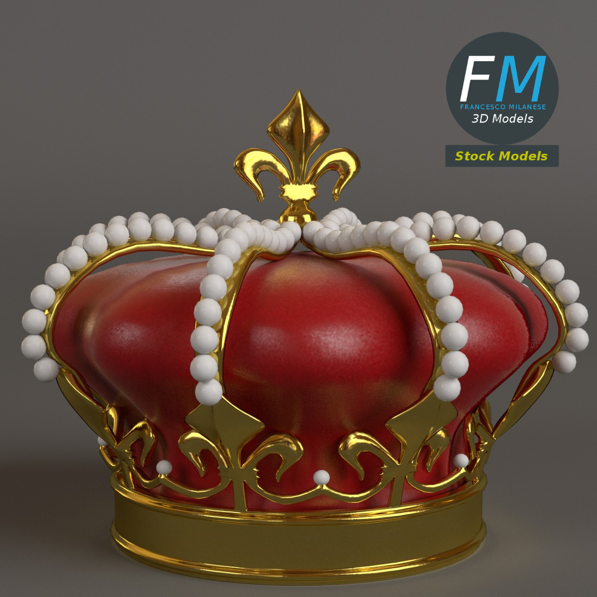 Royal crown 3D Model. 3 objects (frame, pearls, velvet --- so you can remove the pearls, for example), each one with its own non overlapping UV Layout map, Material and PBR Textures set. Production-ready 3D Model, with PBR materials, textures, non overlapping UV Layout map provided in the package.