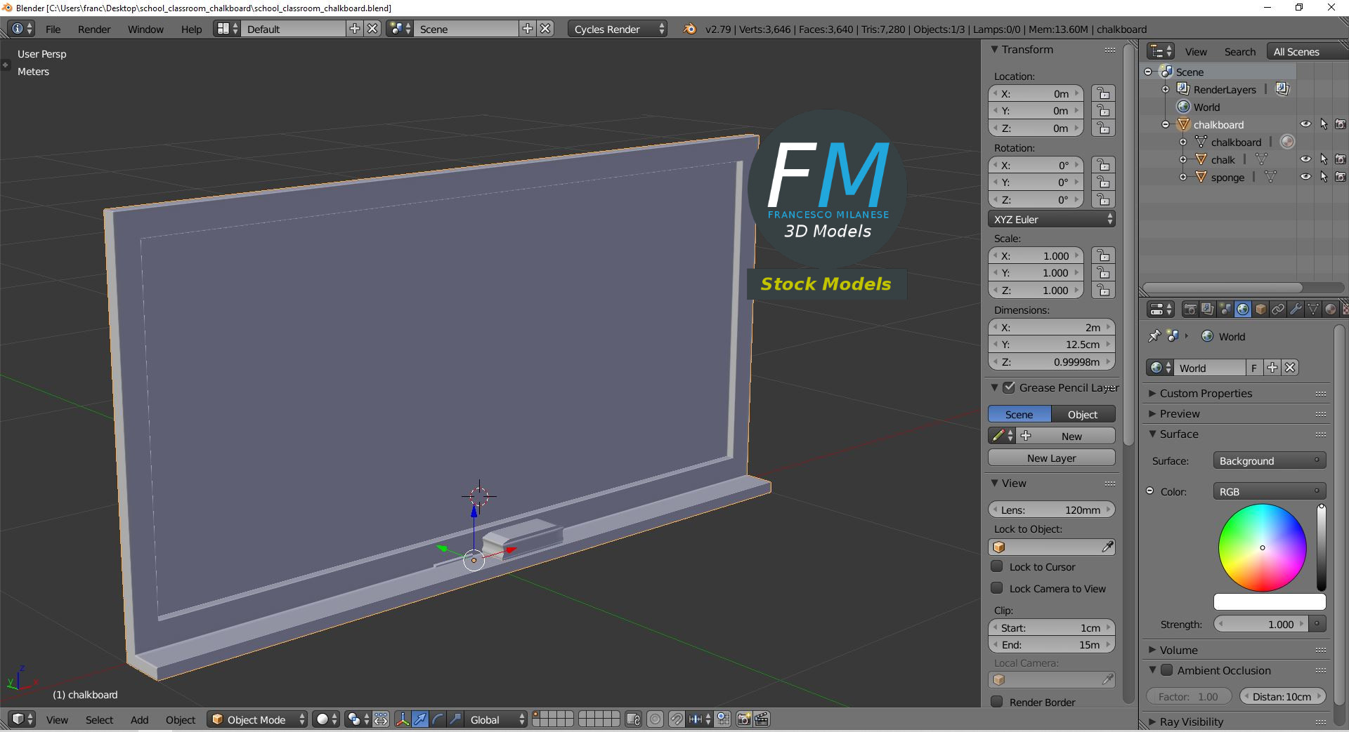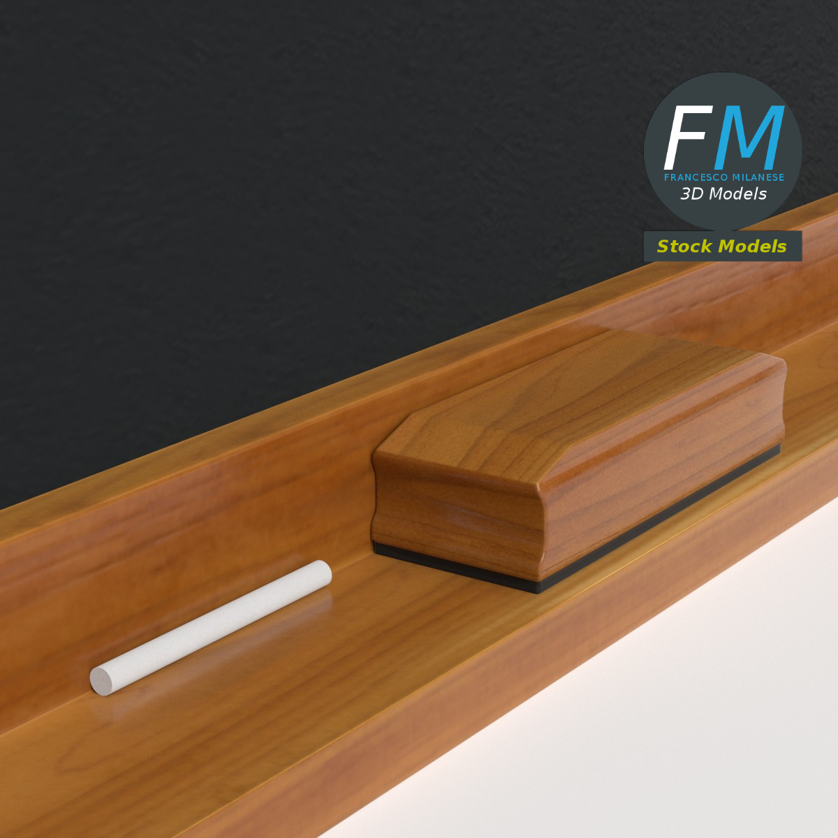School classroom chalkboard 3D Model. 3 individual objects (chalk, chalkboard, sponge), sharing the same non overlapping UV Layout map, Material and PBR Textures set. Production-ready 3D Model, with PBR materials, textures, non overlapping UV Layout map provided in the package.
