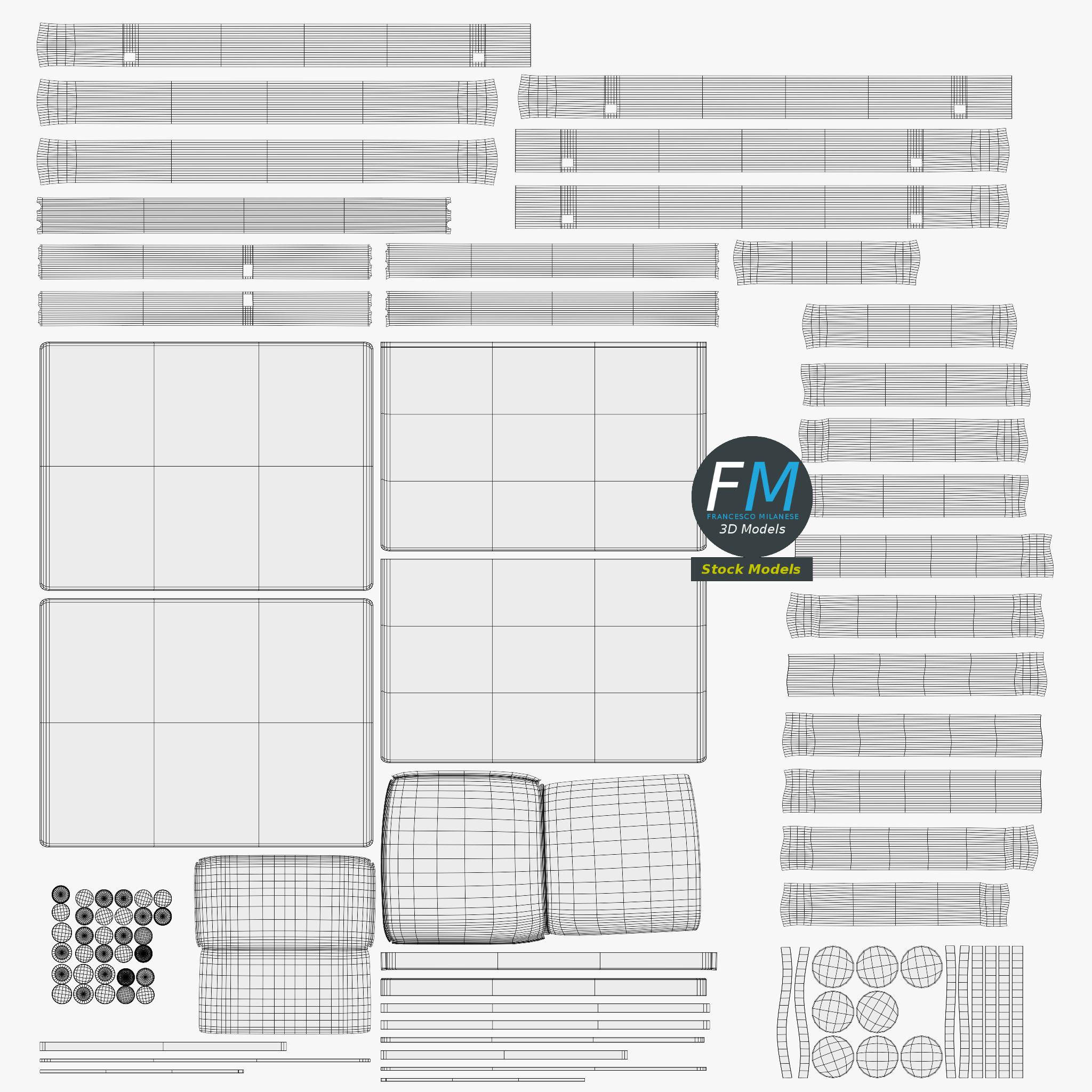 Easily customizable: UV unwrapped geometries; UV Layout maps provided in the package as png with alpha images.