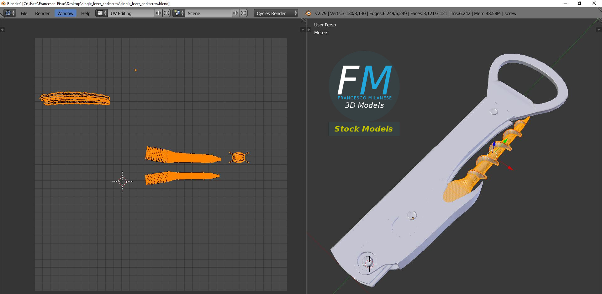 A single lever Corkscrew 3D Model; 3 objects, parented, so you can easily edit, rotate, rig or animate them (see preview images); a single, non overlapping UV Layout map, Material and PBR Textures set for all the three objects. Production-ready 3D Model, with PBR materials, textures, and non overlapping UV Layout map provided in the package.