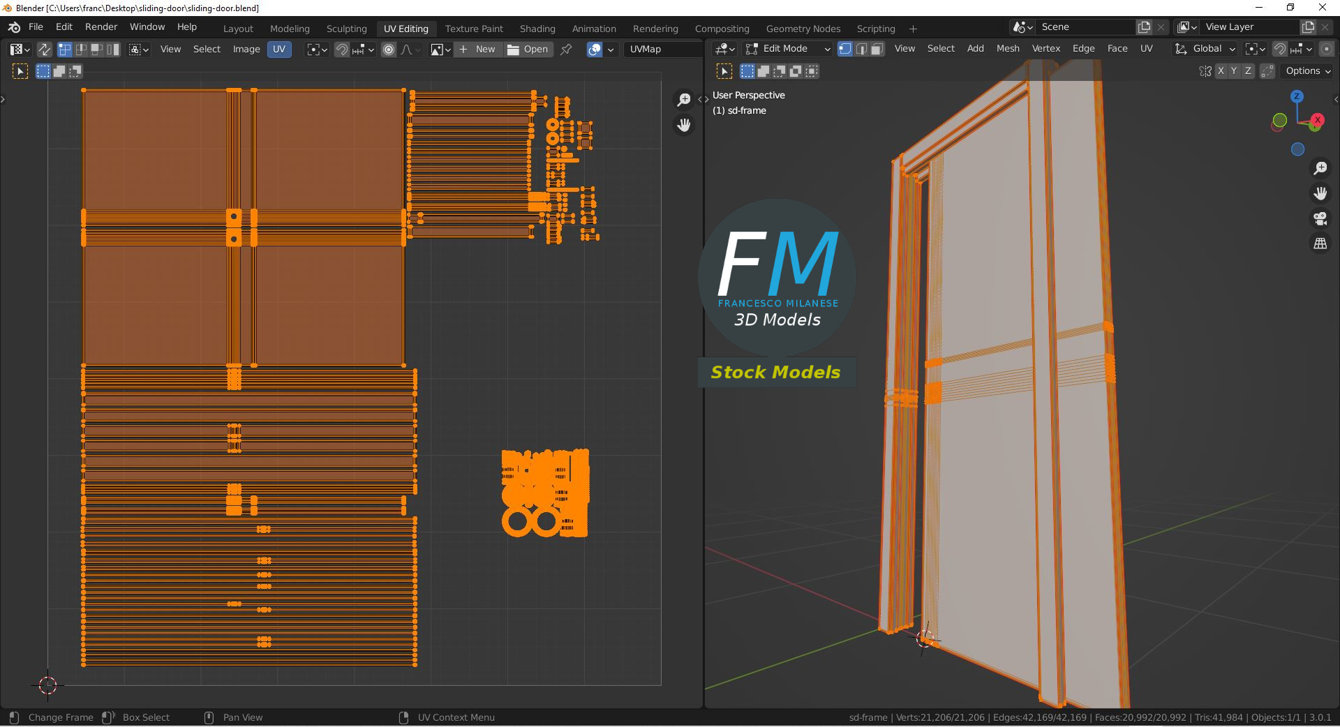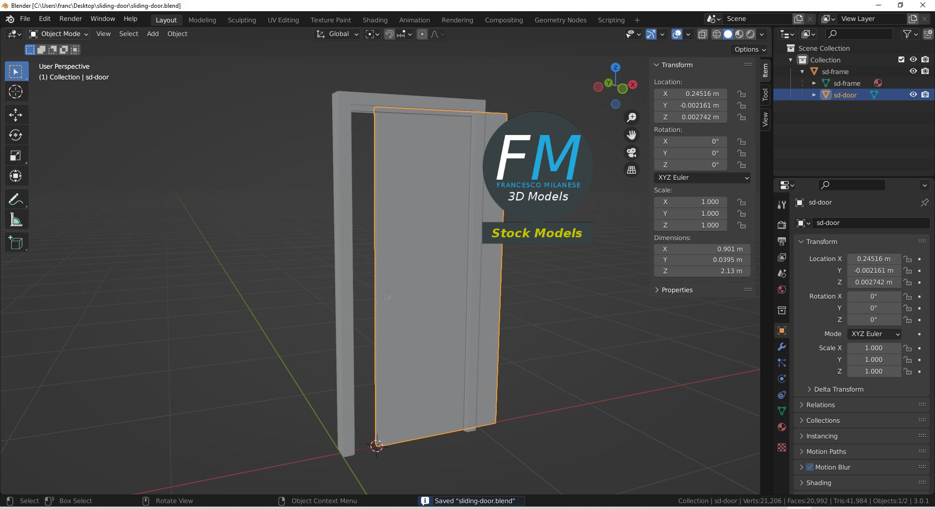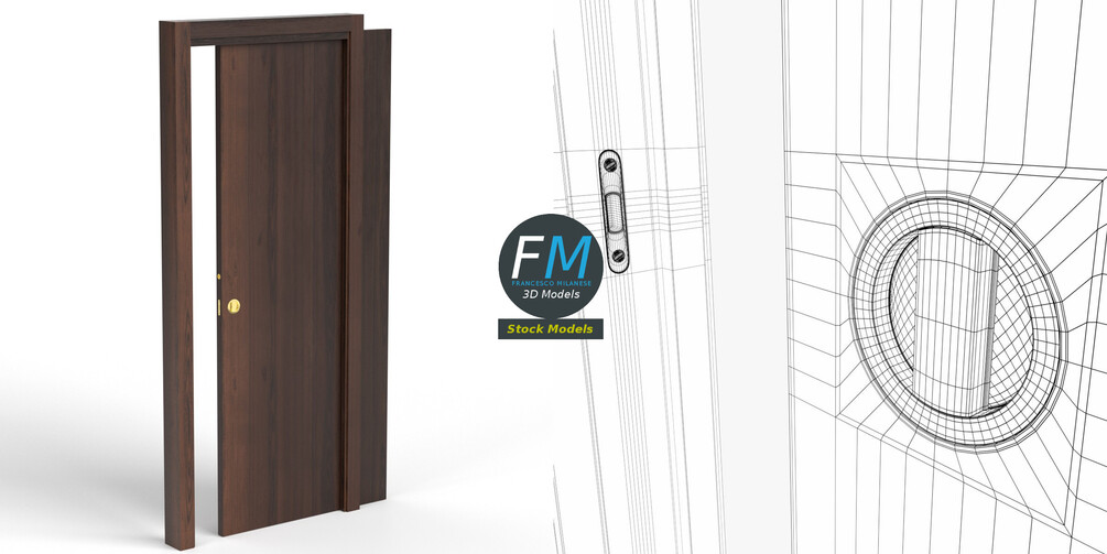 Wooden sliding door 3D Model. 2 individual objects (frame, door; so, you can easily open or even animate it), sharing the same non overlapping UV Layout map, Material and PBR Textures set. Production-ready 3D Model, with PBR materials, textures, non overlapping UV Layout map provided in the package.