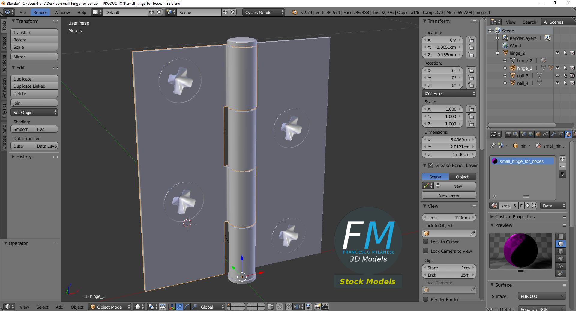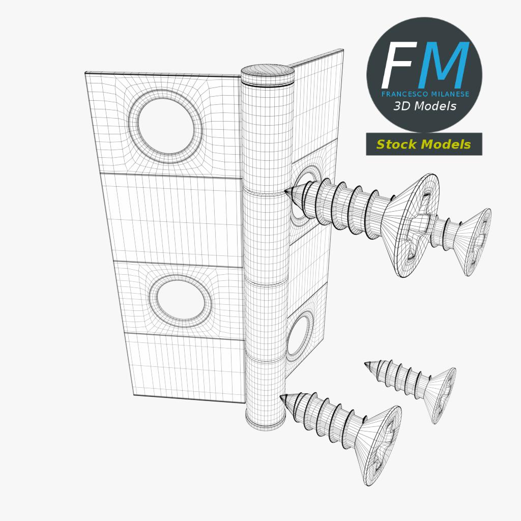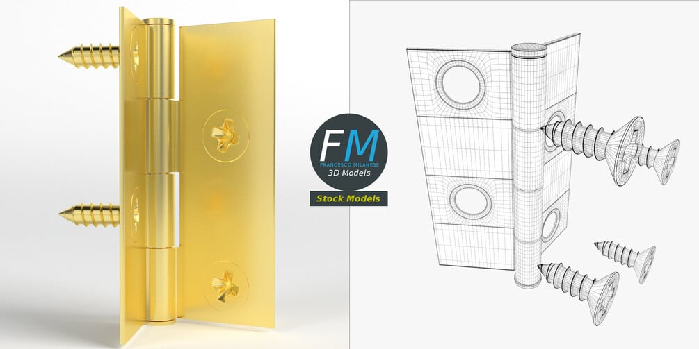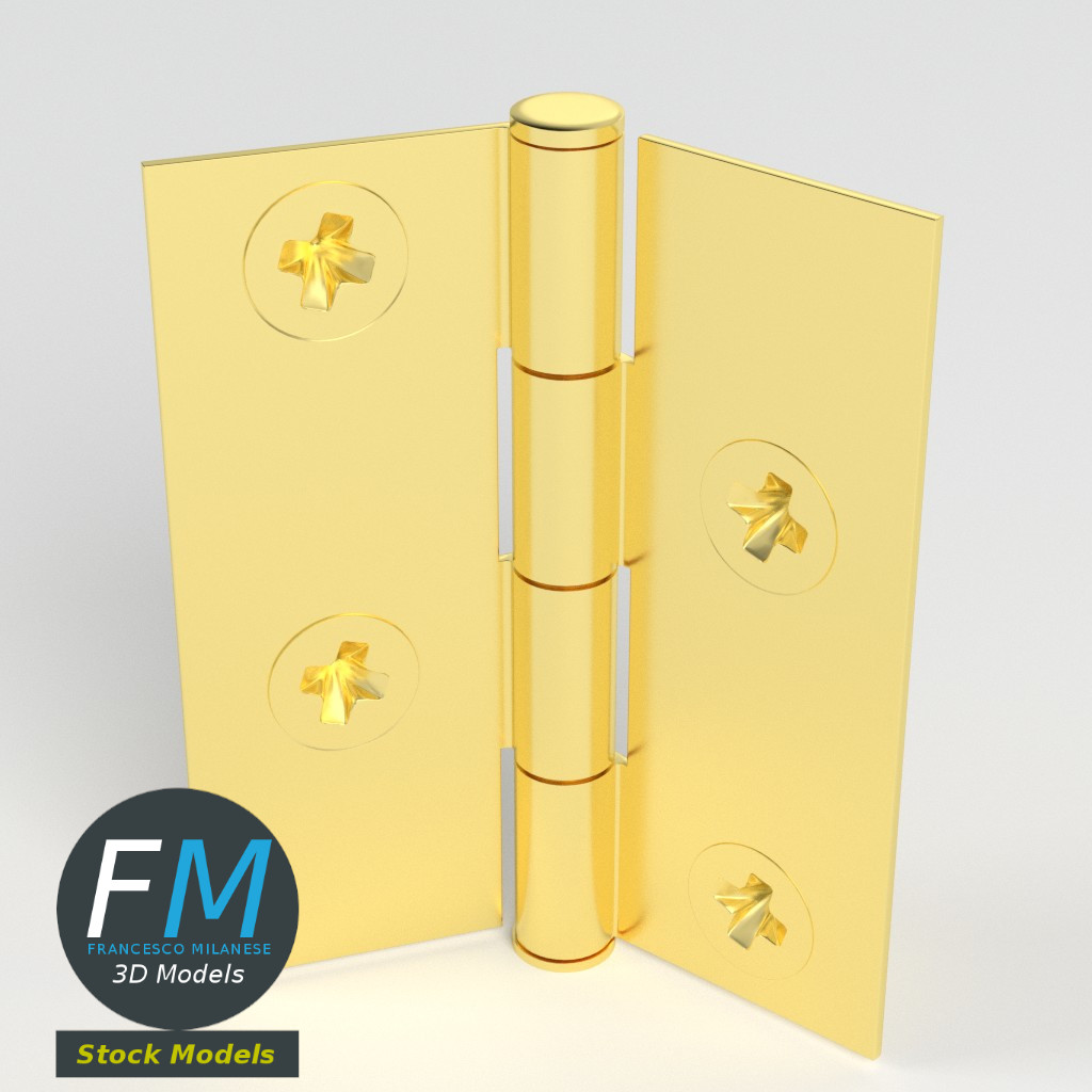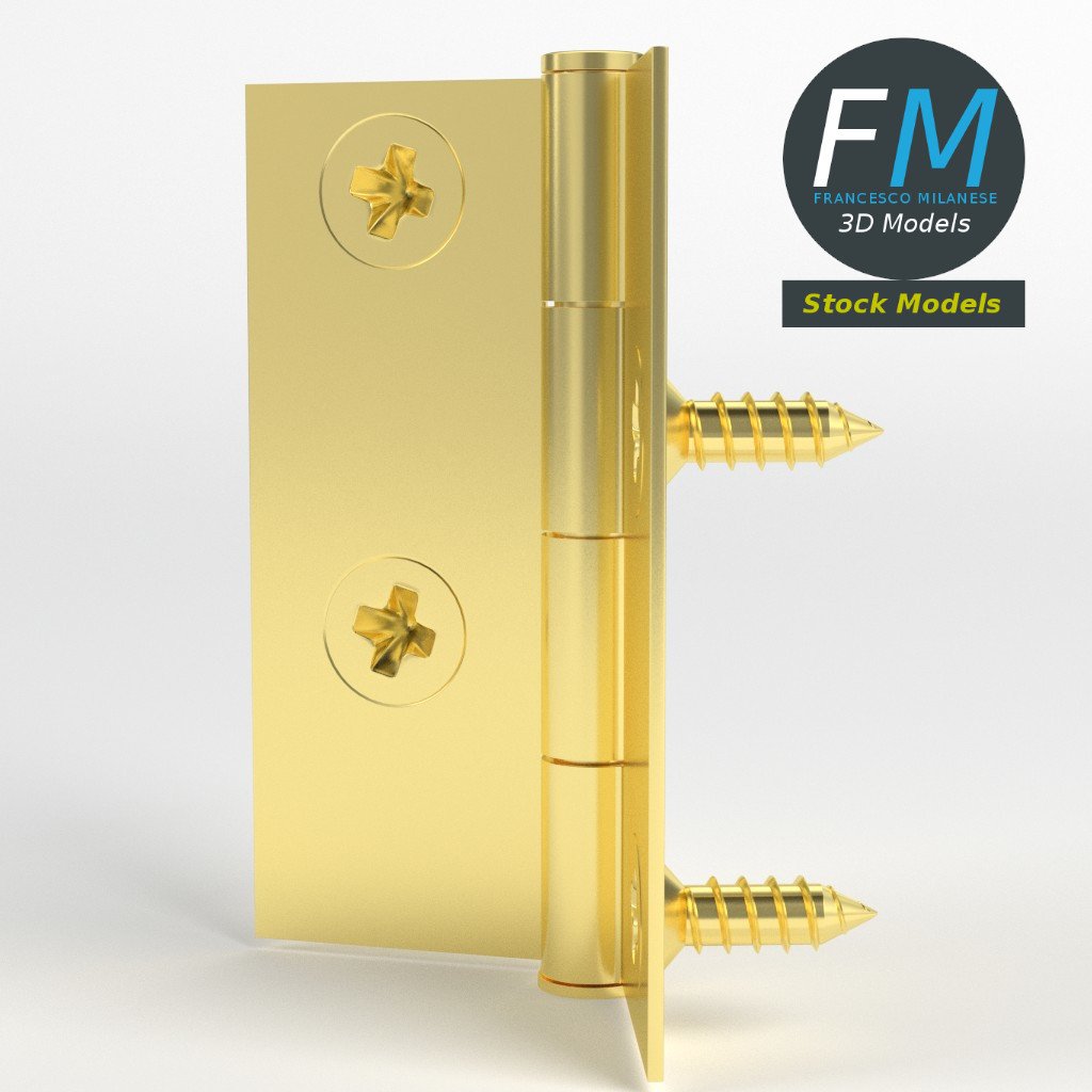 Small hinge for boxes 3D Models set. 6 individual objects (2 hinge parts, 4 nails; so, you can easily rotate or even animate them) sharing the same non overlapping UV Layout map, Material and PBR Textures set. Production-ready 3D Model, with PBR materials, textures, non overlapping UV Layout map provided in the package.