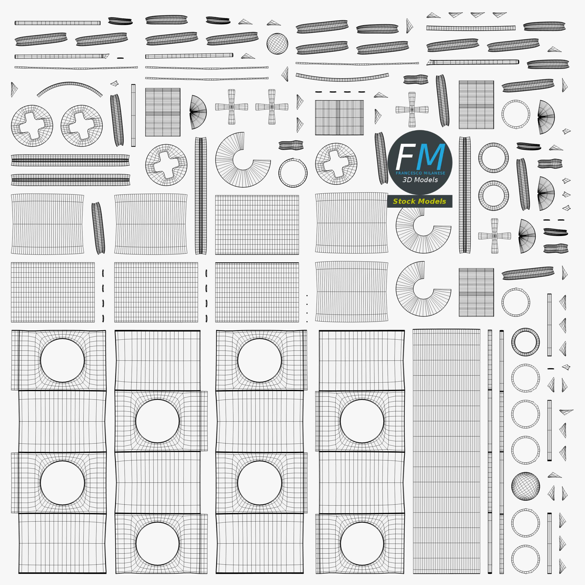 Easily customizable: UV unwrapped geometries, so you can create new Textures (or modify the existing ones) using the UV Layout maps provided in the package (as png with alpha).