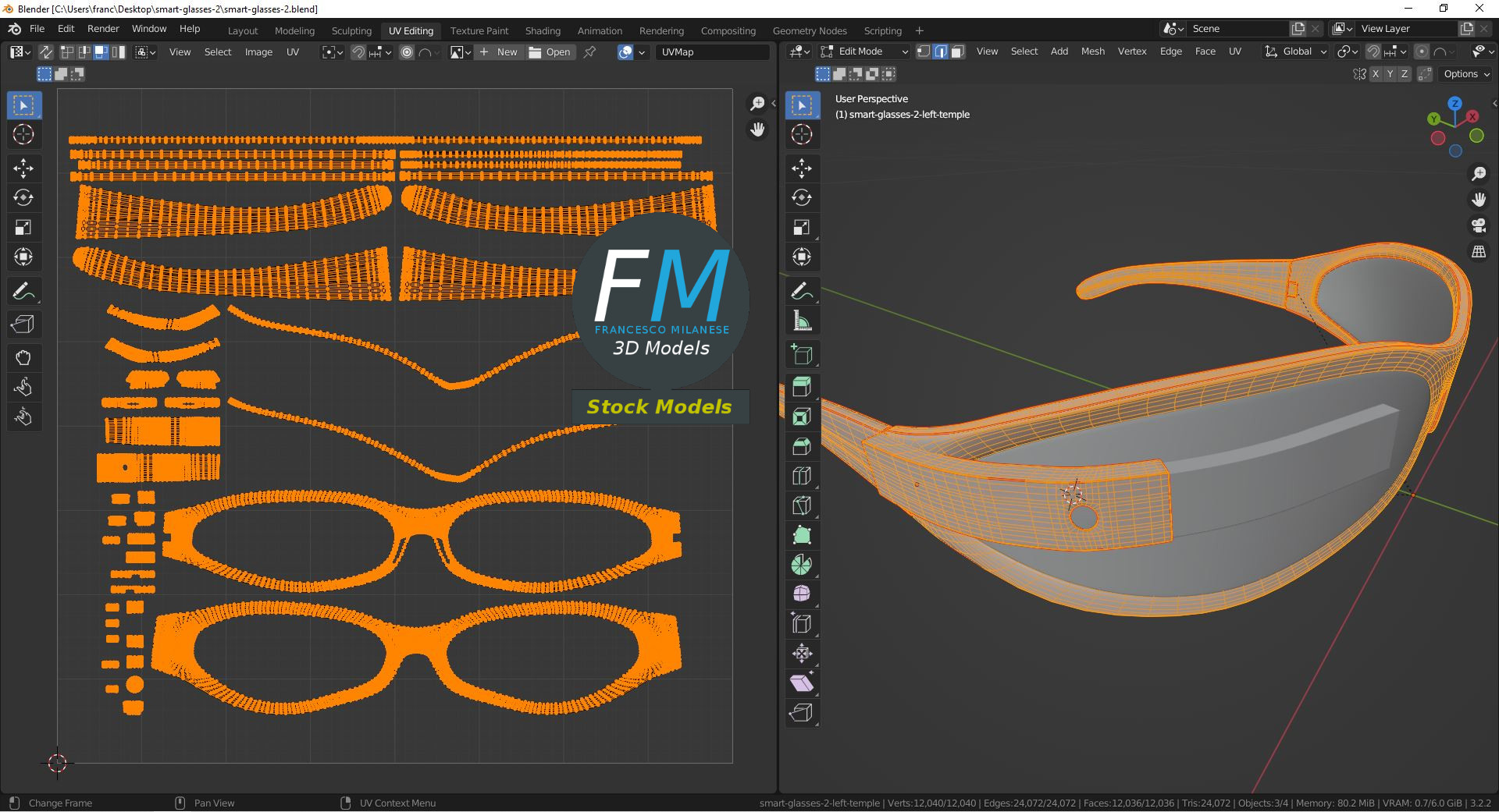 Smart glasses 3D Model, nr. 2 in my collection. 4 individual objects (lenses, frame, 2 individual temples; so, you can easily rotate or even animate them), sharing 2 non overlapping UV Layout maps, Materials (glasses, frame) and PBR Textures sets. Production-ready 3D Model, with PBR materials, textures, non overlapping UV Layout map provided in the package.