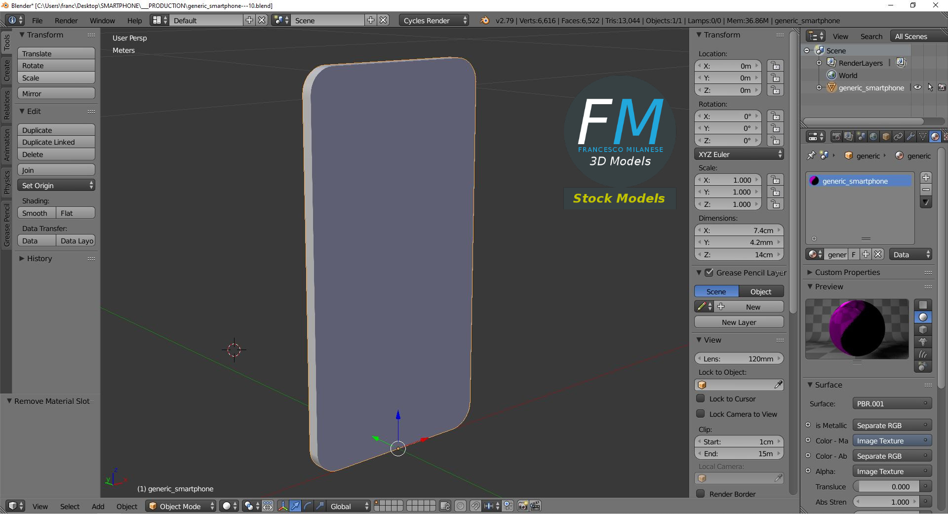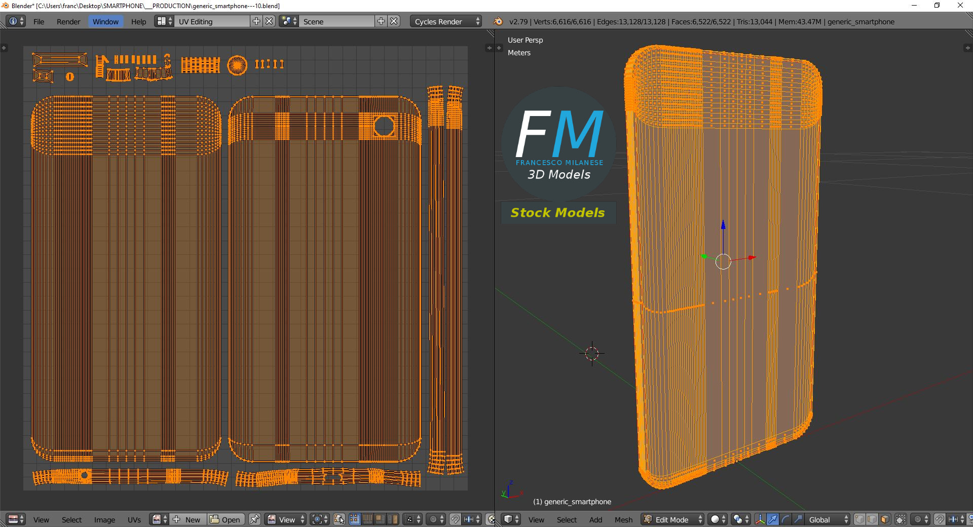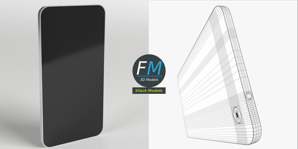 Generic smartphone 3D Model; perfect for advertising, merchandising, mock-up, copy space template, etc.. Production-ready 3D Model, with PBR materials, textures, non overlapping UV Layout map provided in the package.