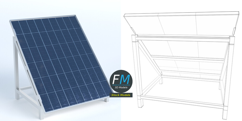 A solar panel (photovoltaic panel) on stand 3D Model; 2 objects (the panel and the frame in a single object, plus a "glass" object), each one with its own non overlapping UV Layout map, Material and PBR Textures set (see preview images). Production-ready 3D Model, with PBR materials, textures, and non overlapping UV Layout map provided in the package.