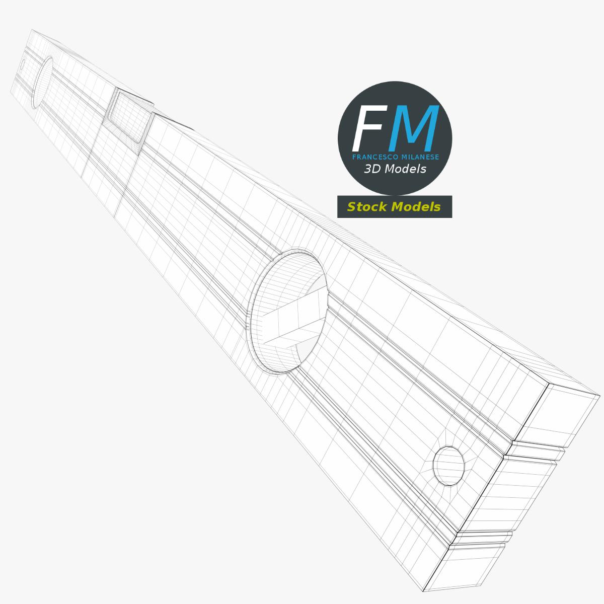 Torpedo spirit level with 50 cm (and inches equivalent) ruler 3D Model. 2 individual objects (frame, transparent parts), each one with its own non overlapping UV Layout map, Material and PBR Textures set. Production-ready 3D Model, with PBR materials, textures, non overlapping UV Layout map provided in the package.
