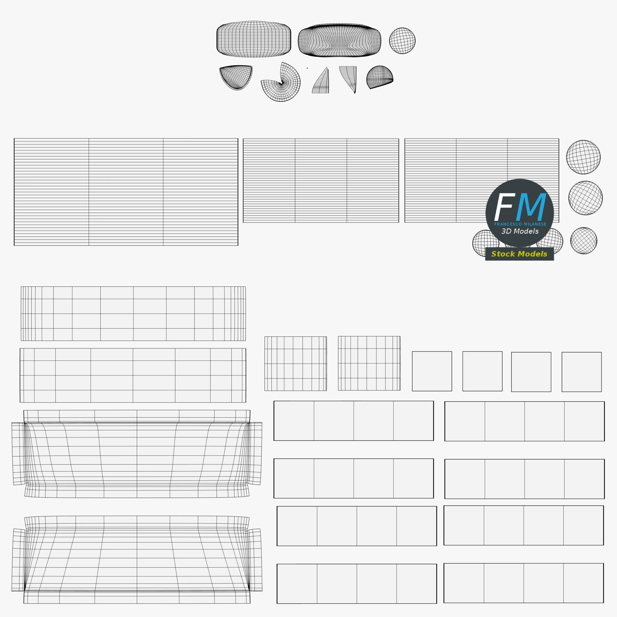 Easily customizable: UV unwrapped geometries, so you can create new Textures (or modify the existing ones) using the UV Layout maps provided in the package (as png with alpha).