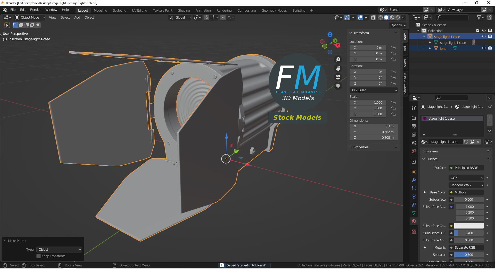 Stage light 3D Model, nr. 1 in my collection. 2 individual objects (main case, lens; so, you can easily assign an emitting material to the lens), each one with its own non overlapping UV Layout map, Material and PBR Textures set. Production-ready 3D Model, with PBR materials, textures, non overlapping UV Layout map provided in the package.