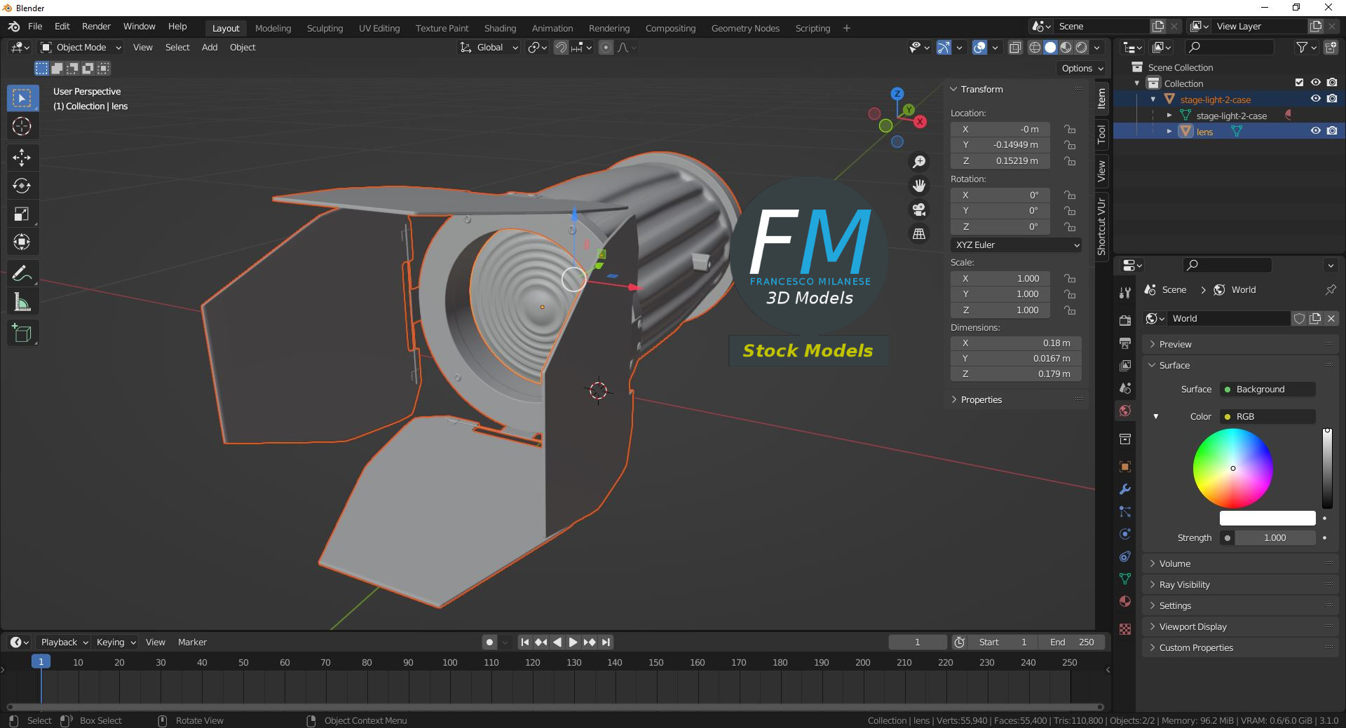 Stage light 3D Model, nr. 2 in my collection. 2 individual objects (case, lens; so, you can easily assign an emitting Material to the lens), each one with its own non-overlapping UV Layout map, Material and PBR Textures set. Production-ready 3D Model, with PBR materials, textures, non overlapping UV Layout map provided in the package.