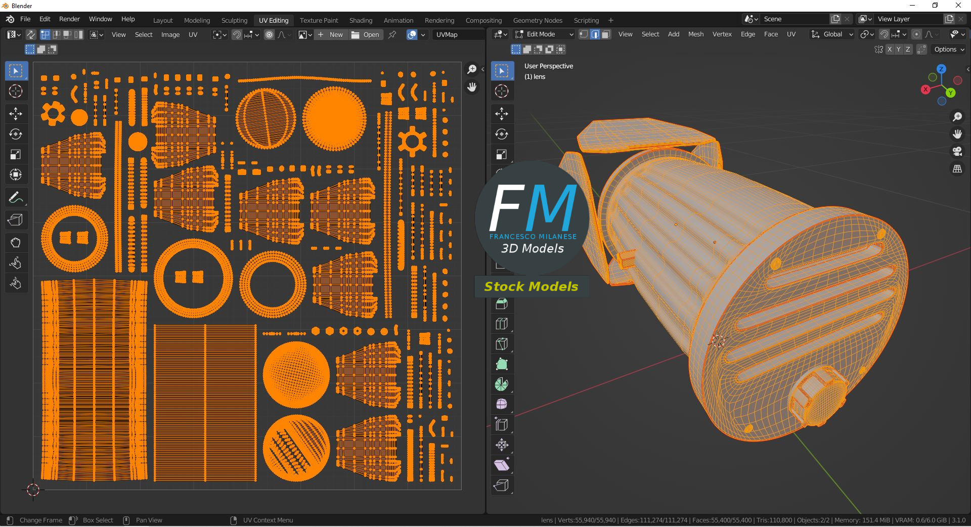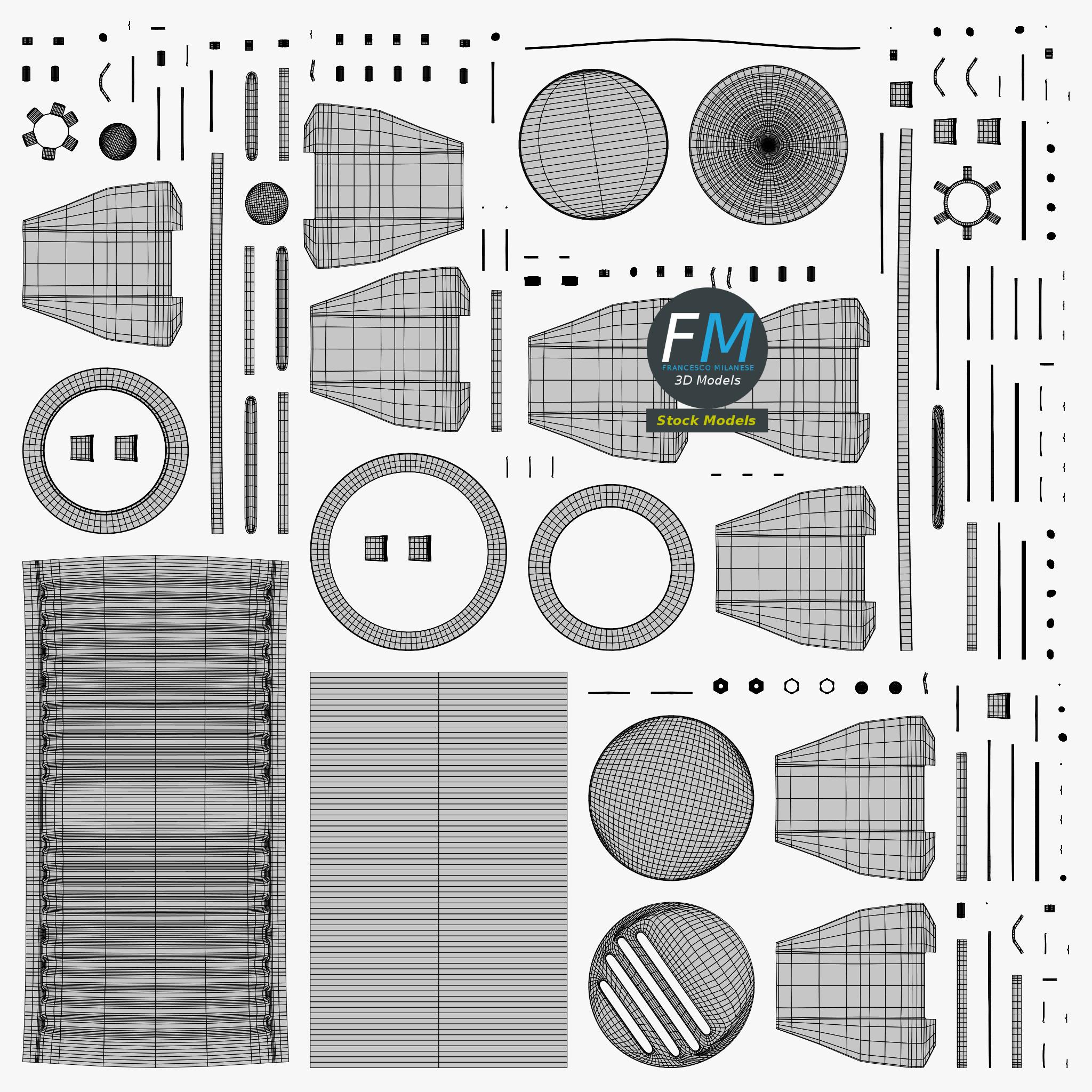 Easily customizable: UV unwrapped geometries, so you can create new Textures (or modify the existing ones) using the UV Layout maps provided in the package (as png with alpha).