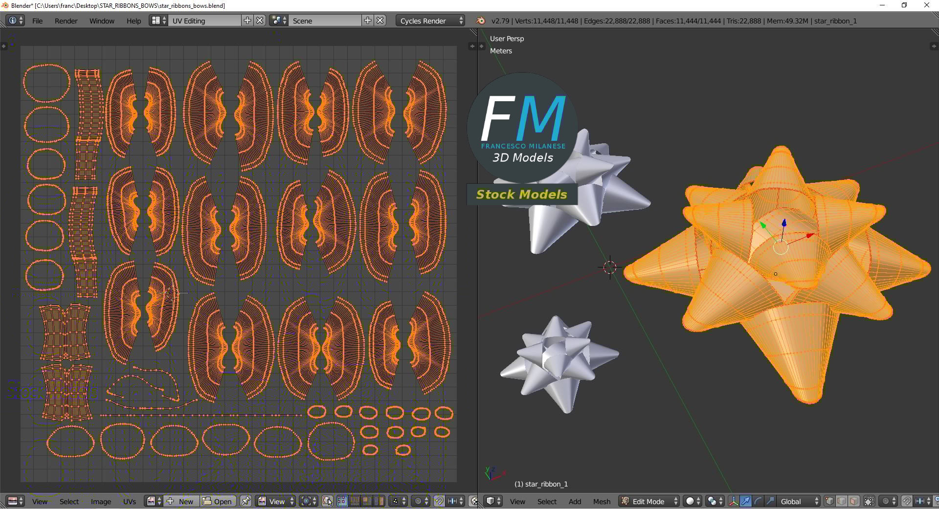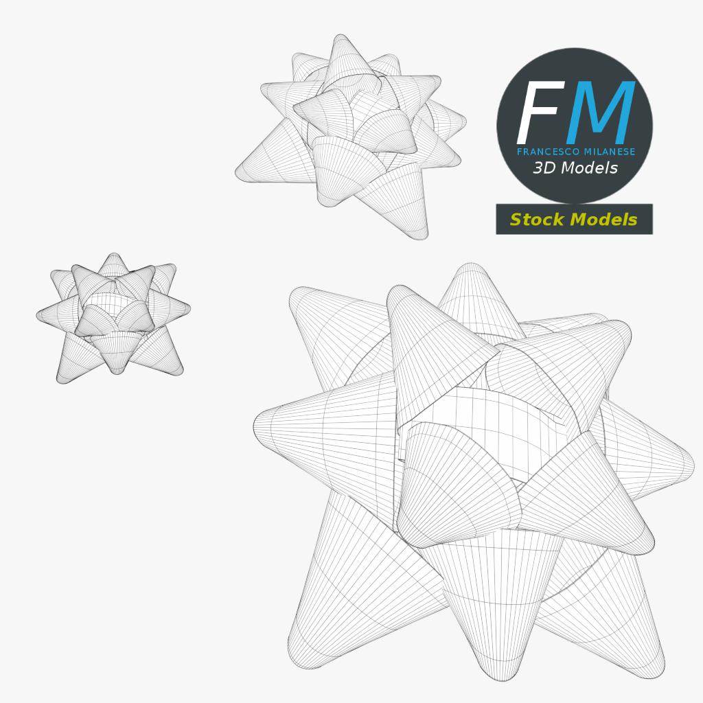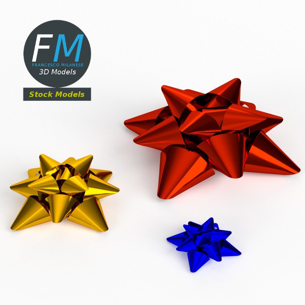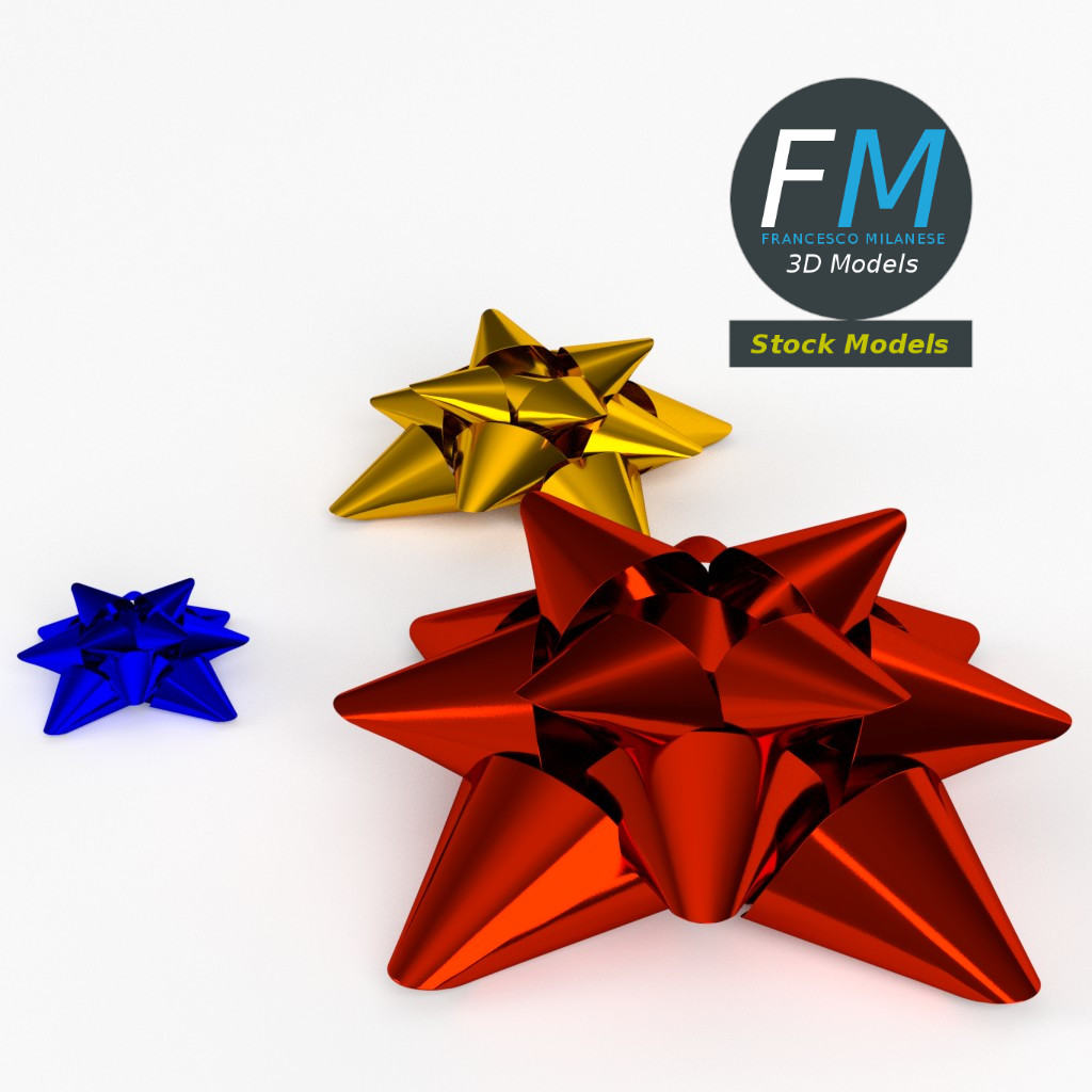 Star ribbons bows 3D Model. 3 individual objects, each one with its own non overlapping UV Layout map, Materials and PBR Textures set. Production-ready 3D Model, with PBR materials, textures, non overlapping UV Layout map provided in the package.