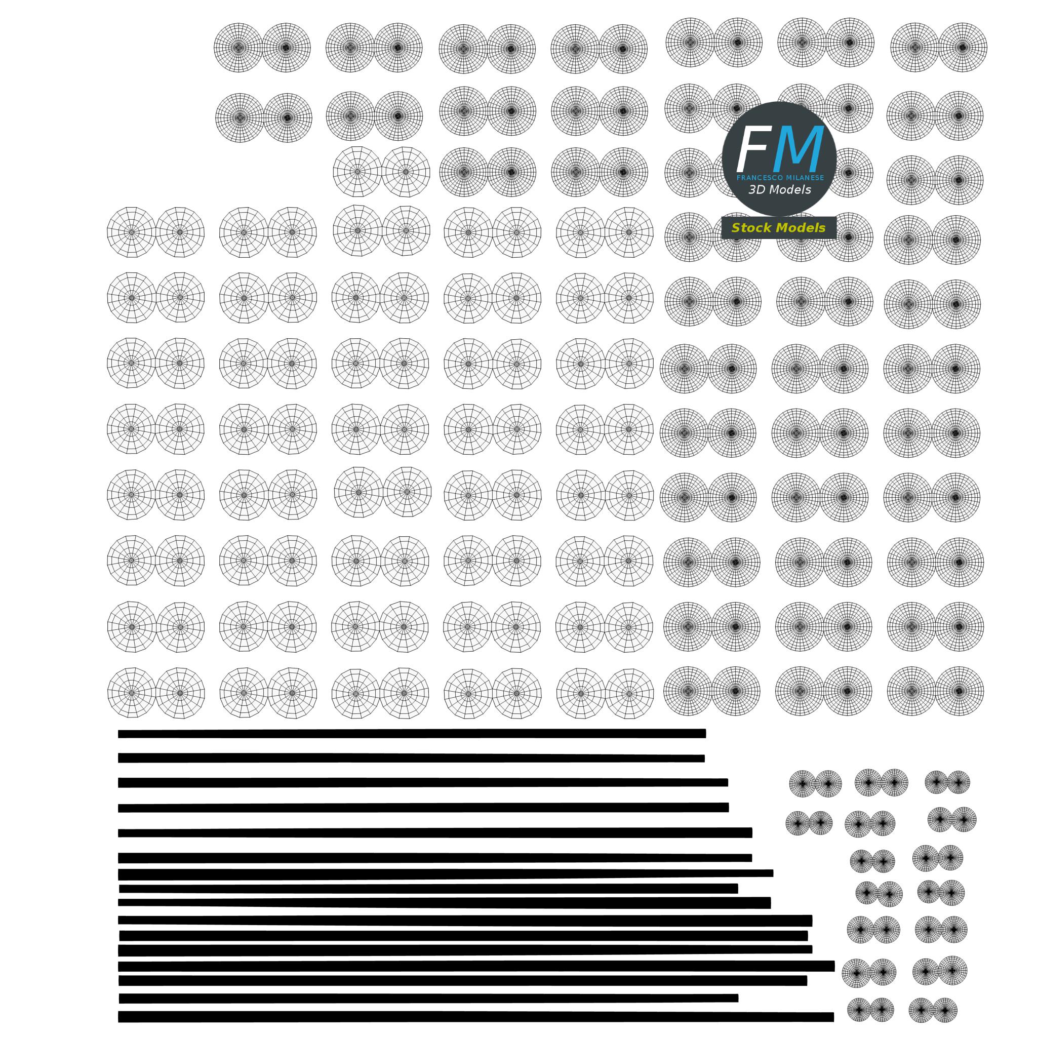 Easily customizable: UV unwrapped geometries, so you can create new Textures (or modify the existing ones) using the UV Layout maps provided in the package (as png with alpha).