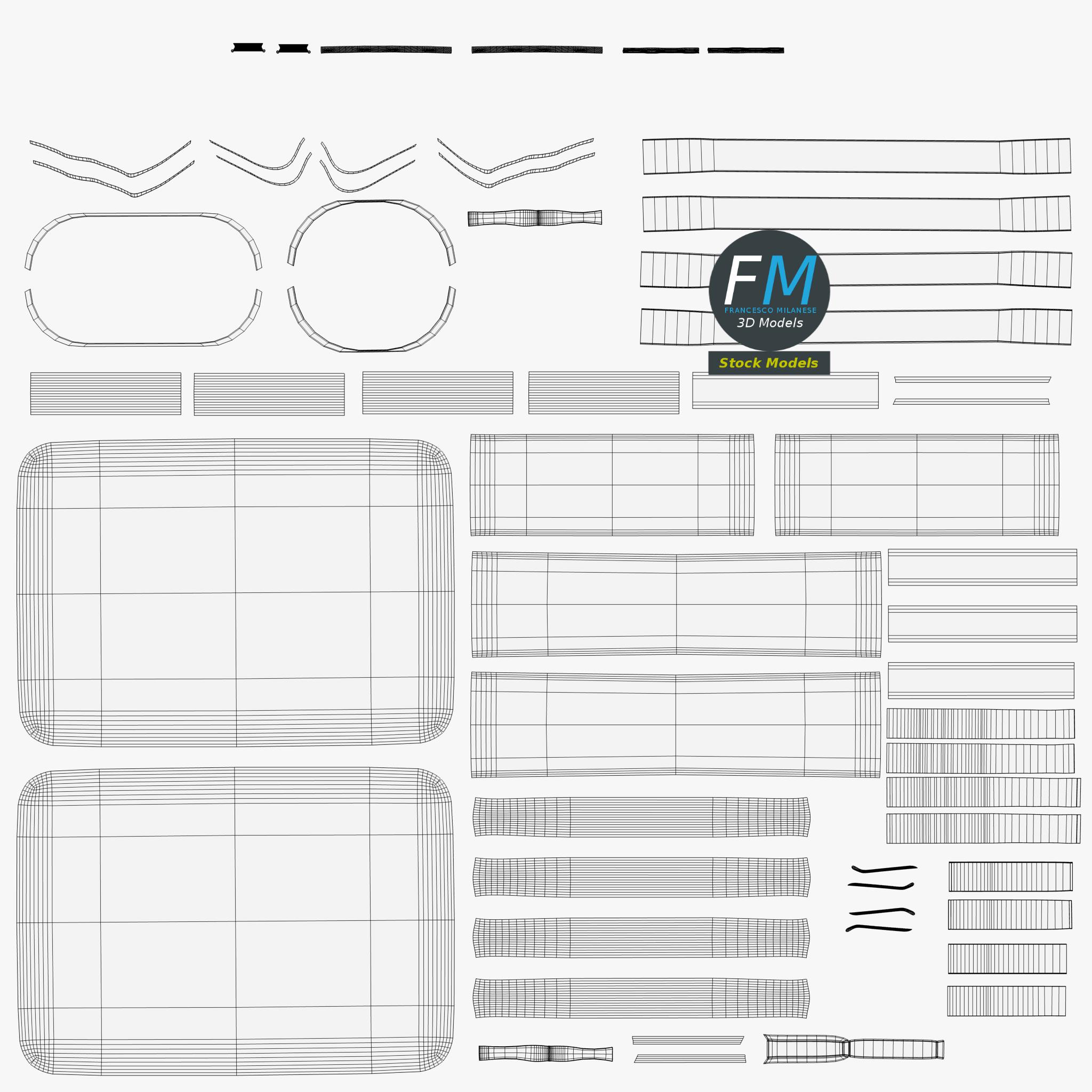 Easily customizable: UV unwrapped geometries, so you can create new Textures (or modify the existing ones) using the UV Layout maps provided in the package (as png with alpha).