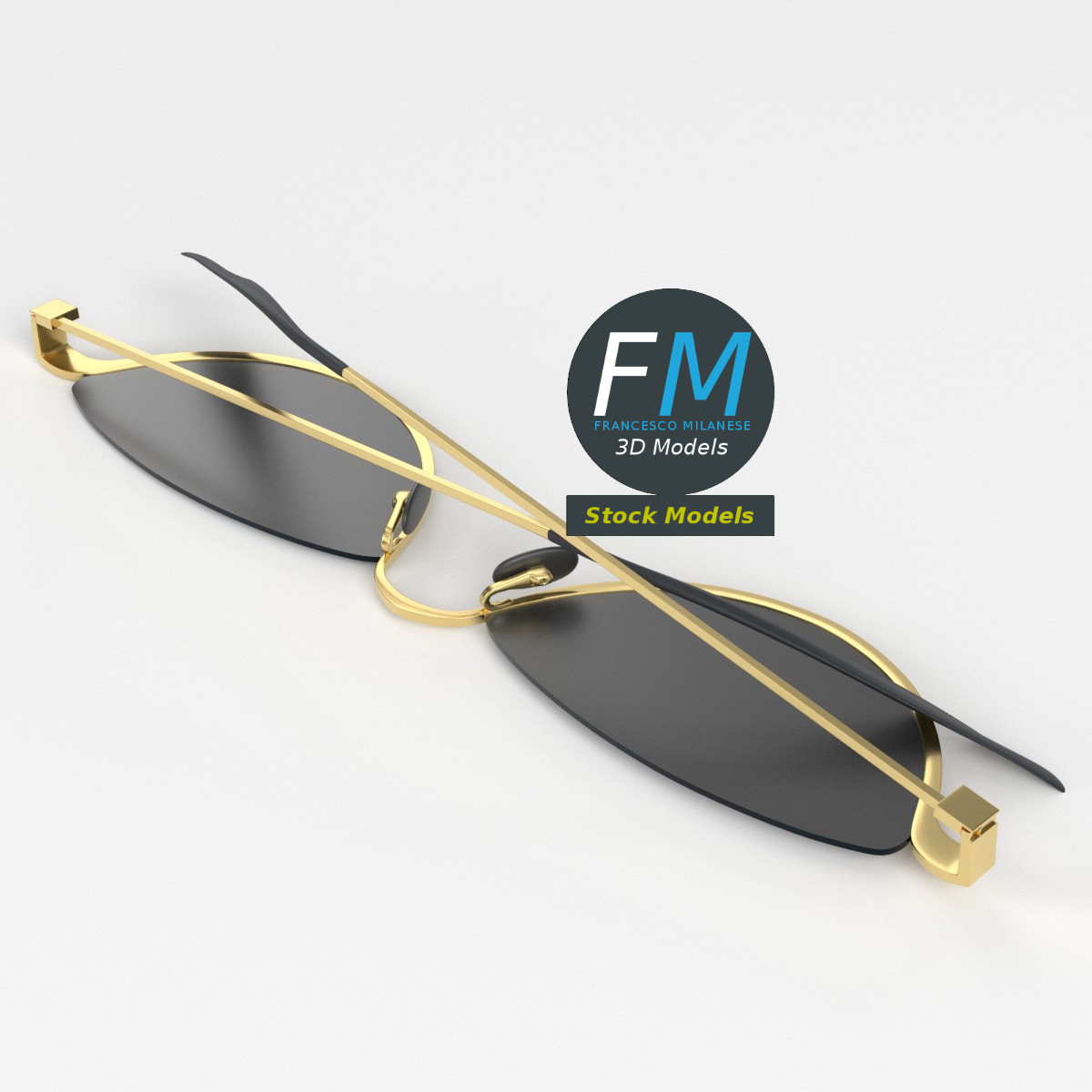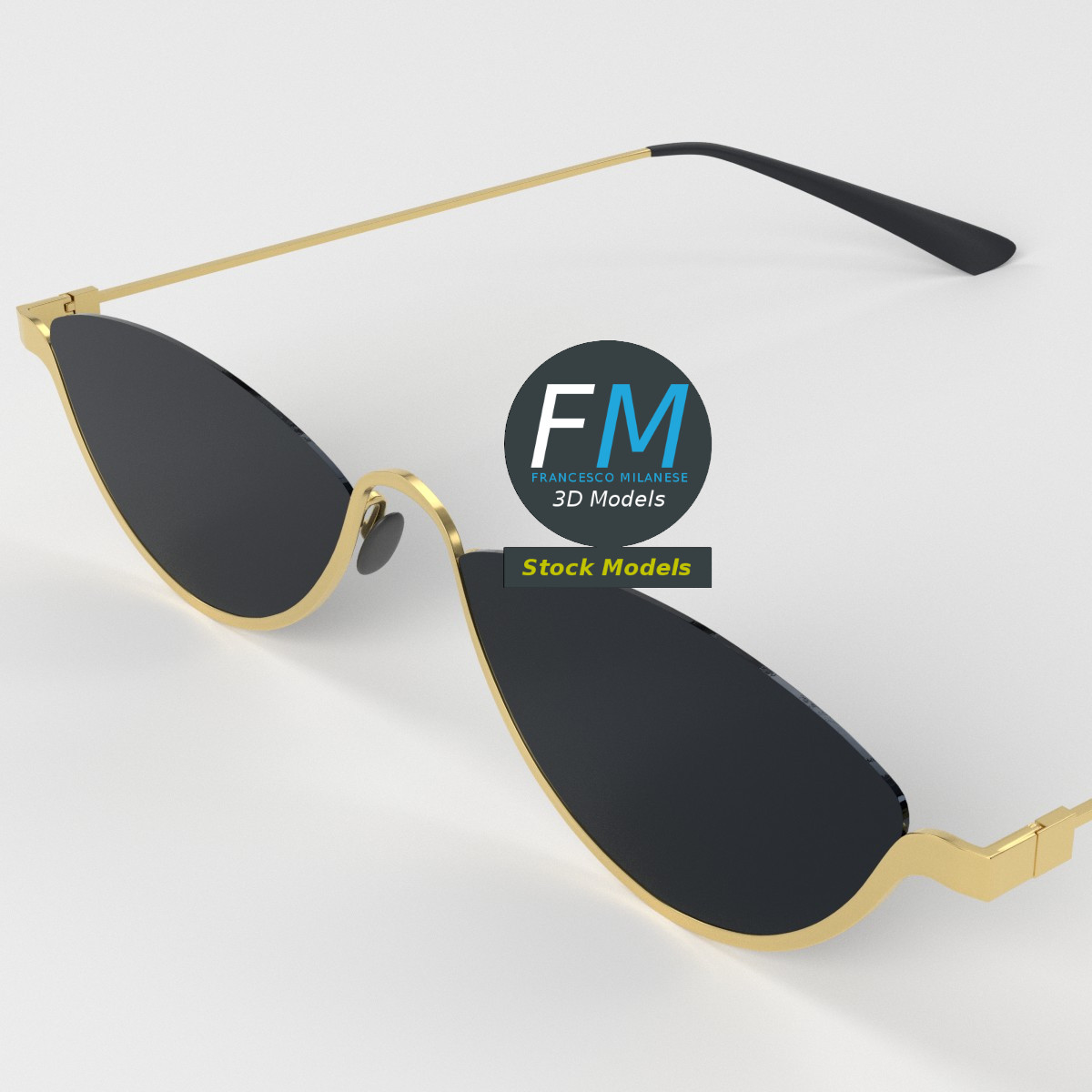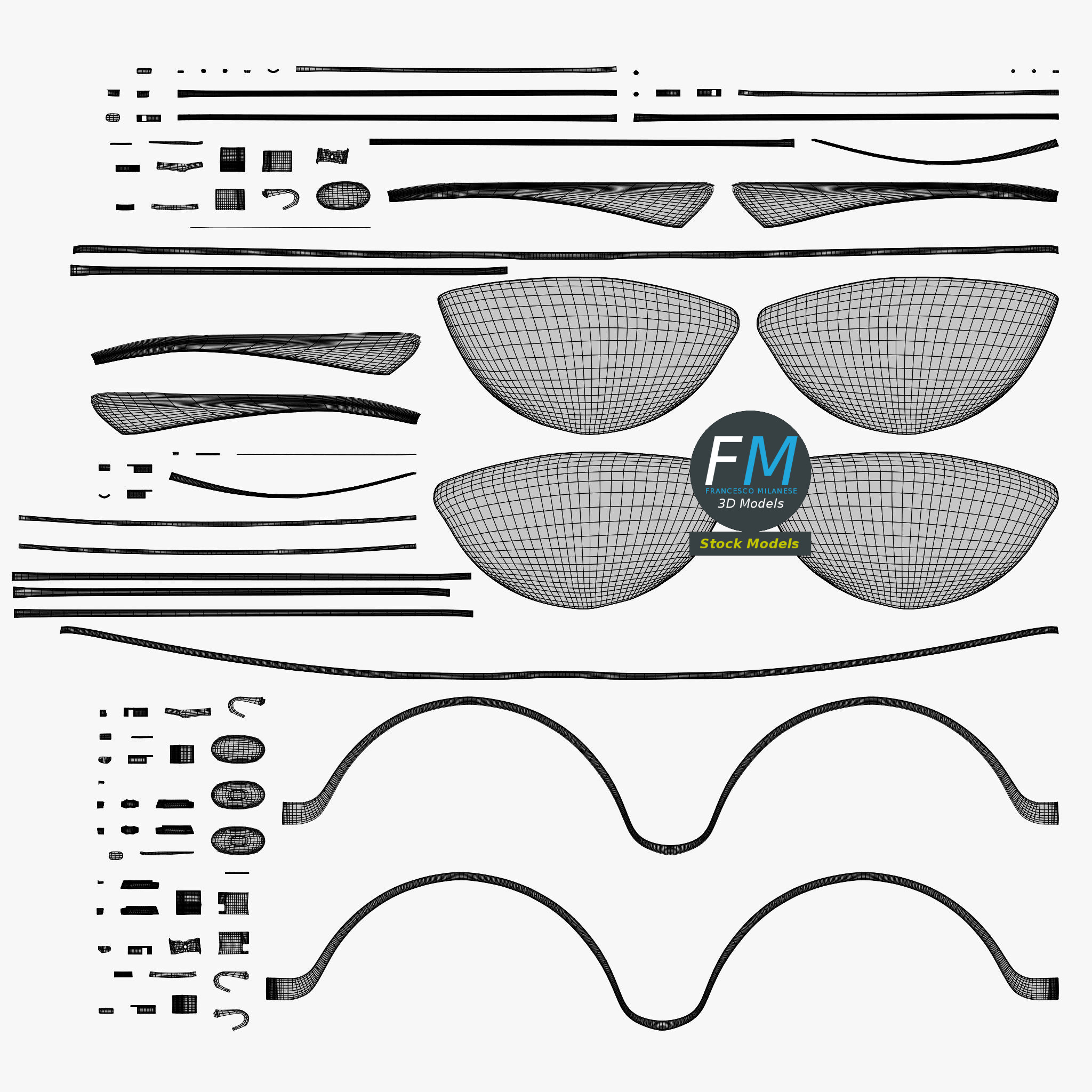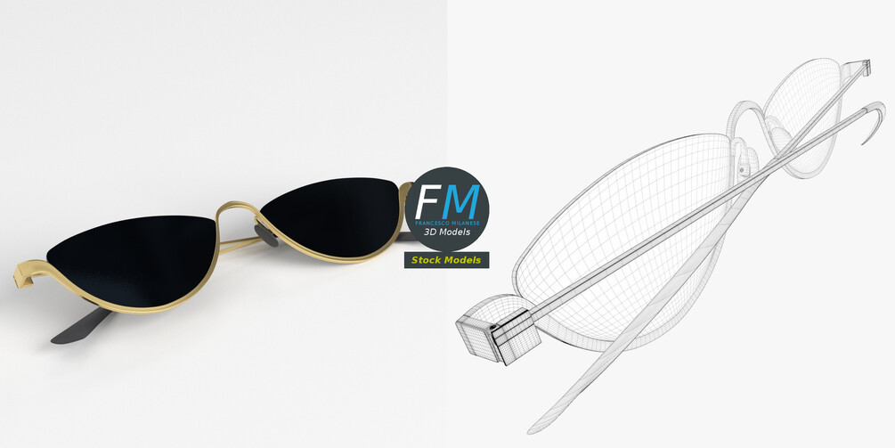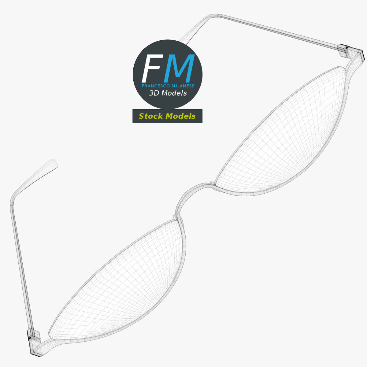 Half eye sunglasses 3D Model; mirror-like lenses (no transparency). 3 individual objects (frame, right temple, left temple; so, you can easily rotate or even animate the temples), sharing the same non overlapping UV Layout map, Material and PBR Textures sets. Production-ready 3D Model, with PBR materials, textures, non overlapping UV Layout map provided in the package.
