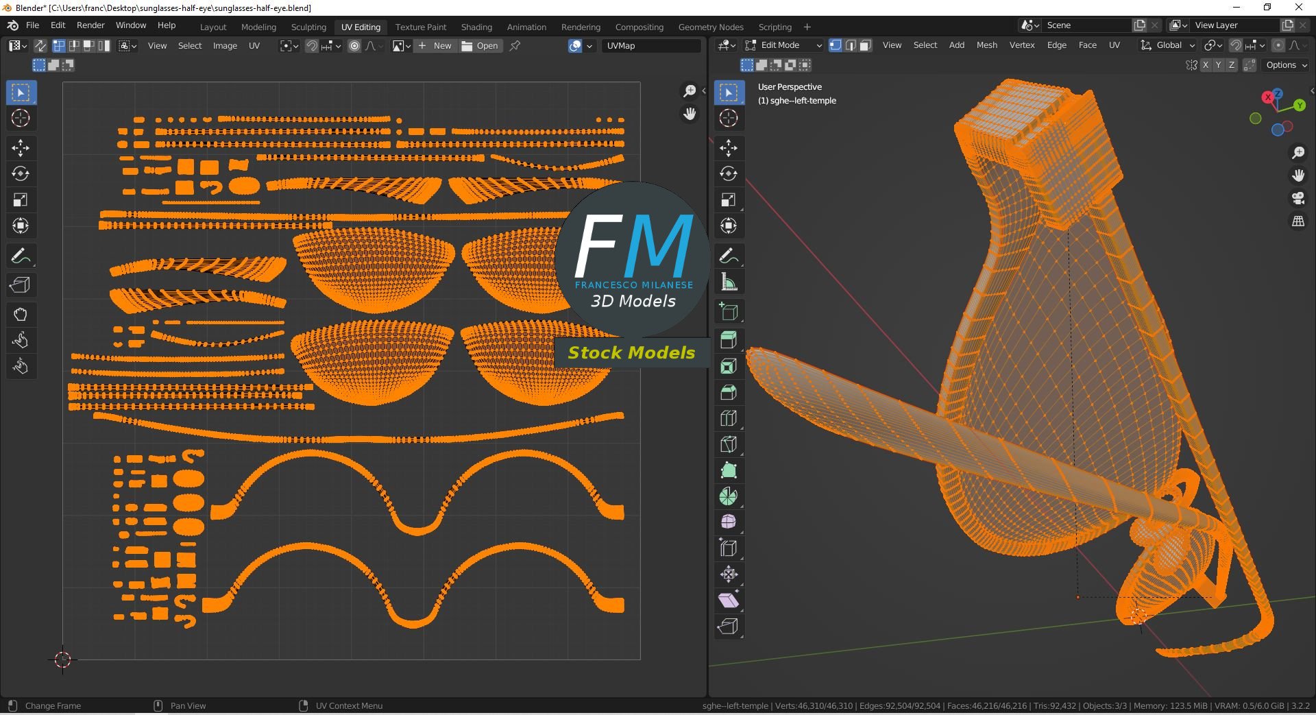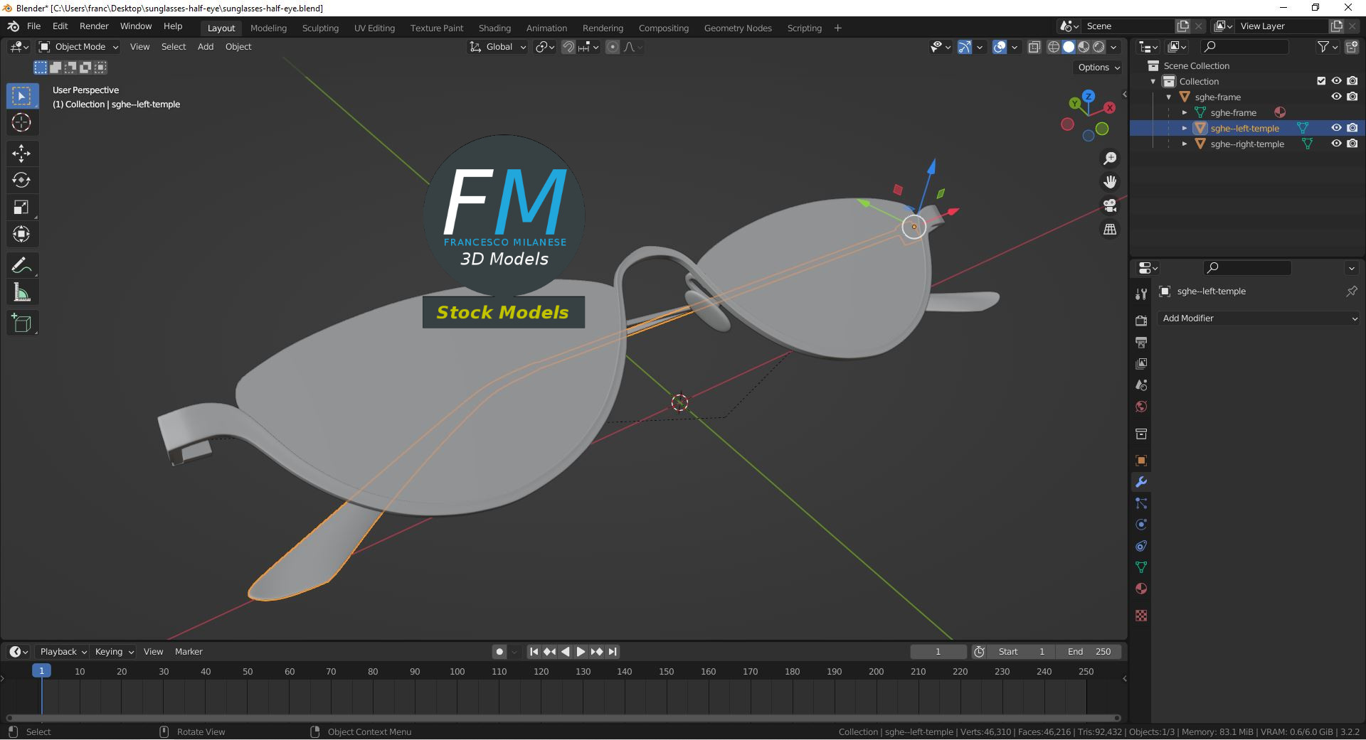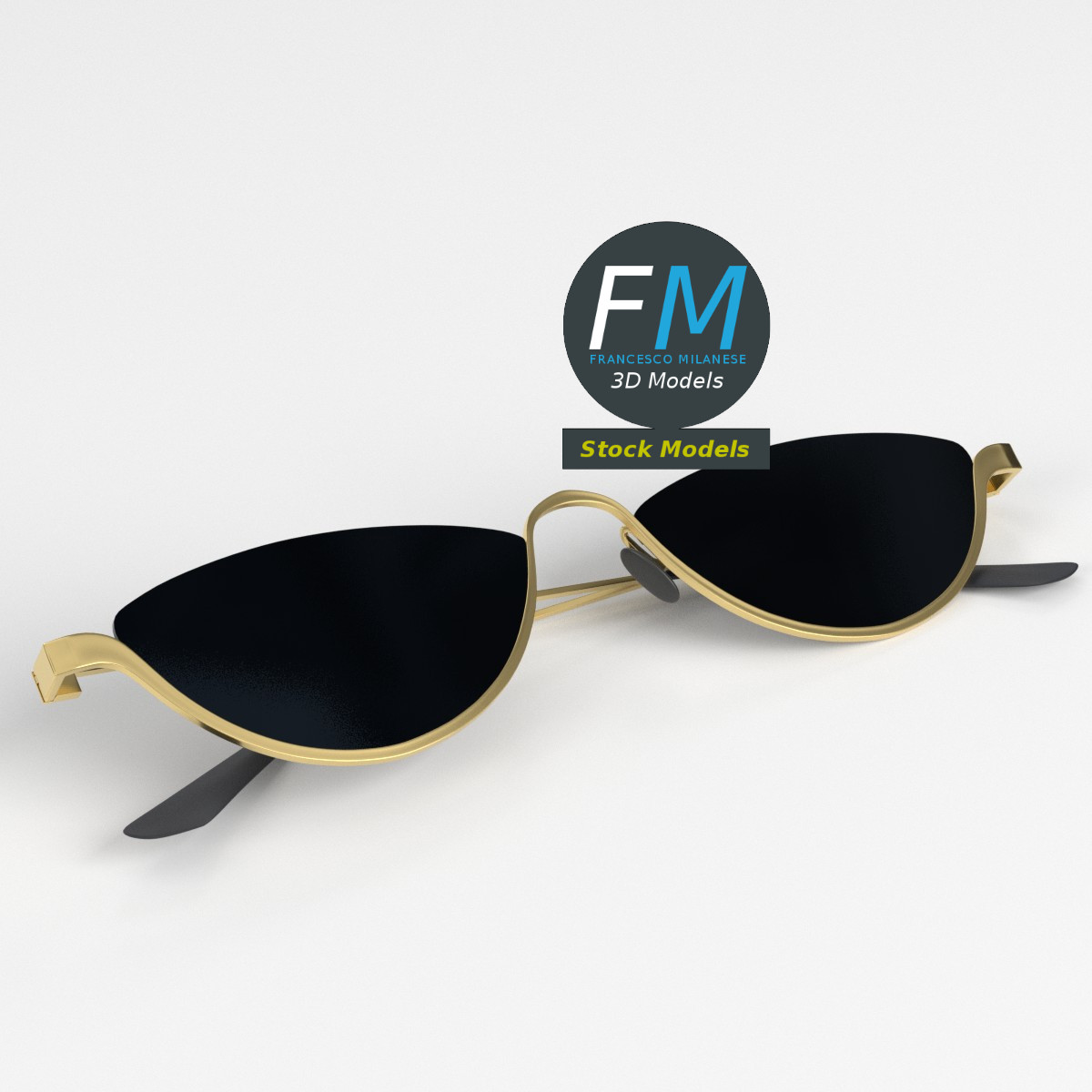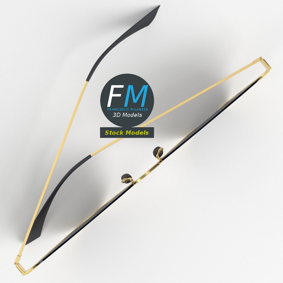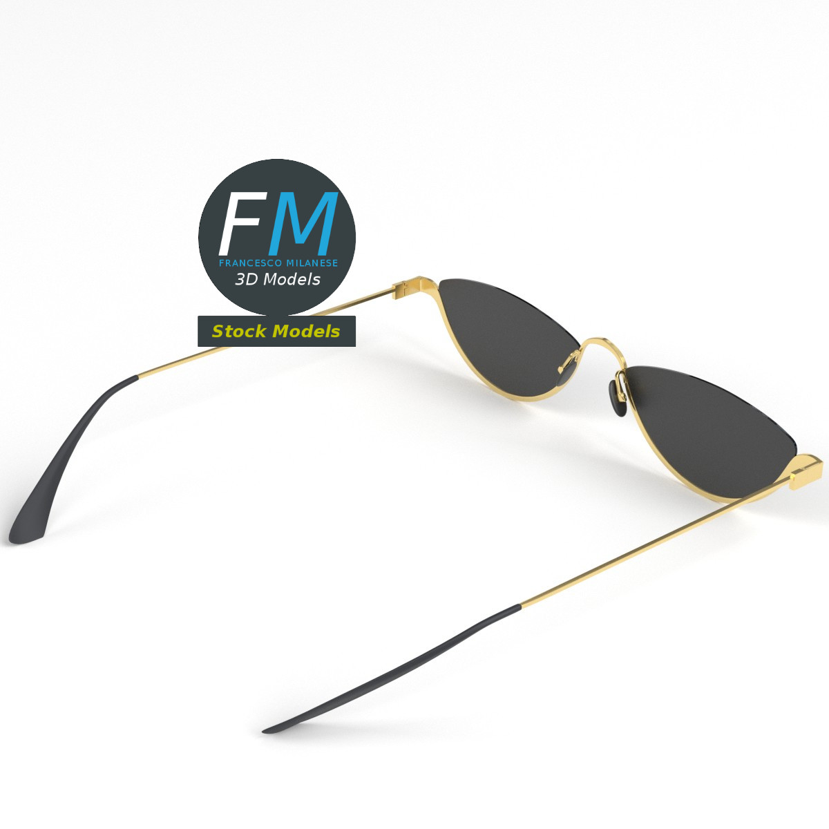 Half eye sunglasses 3D Model; mirror-like lenses (no transparency). 3 individual objects (frame, right temple, left temple; so, you can easily rotate or even animate the temples), sharing the same non overlapping UV Layout map, Material and PBR Textures sets. Production-ready 3D Model, with PBR materials, textures, non overlapping UV Layout map provided in the package.