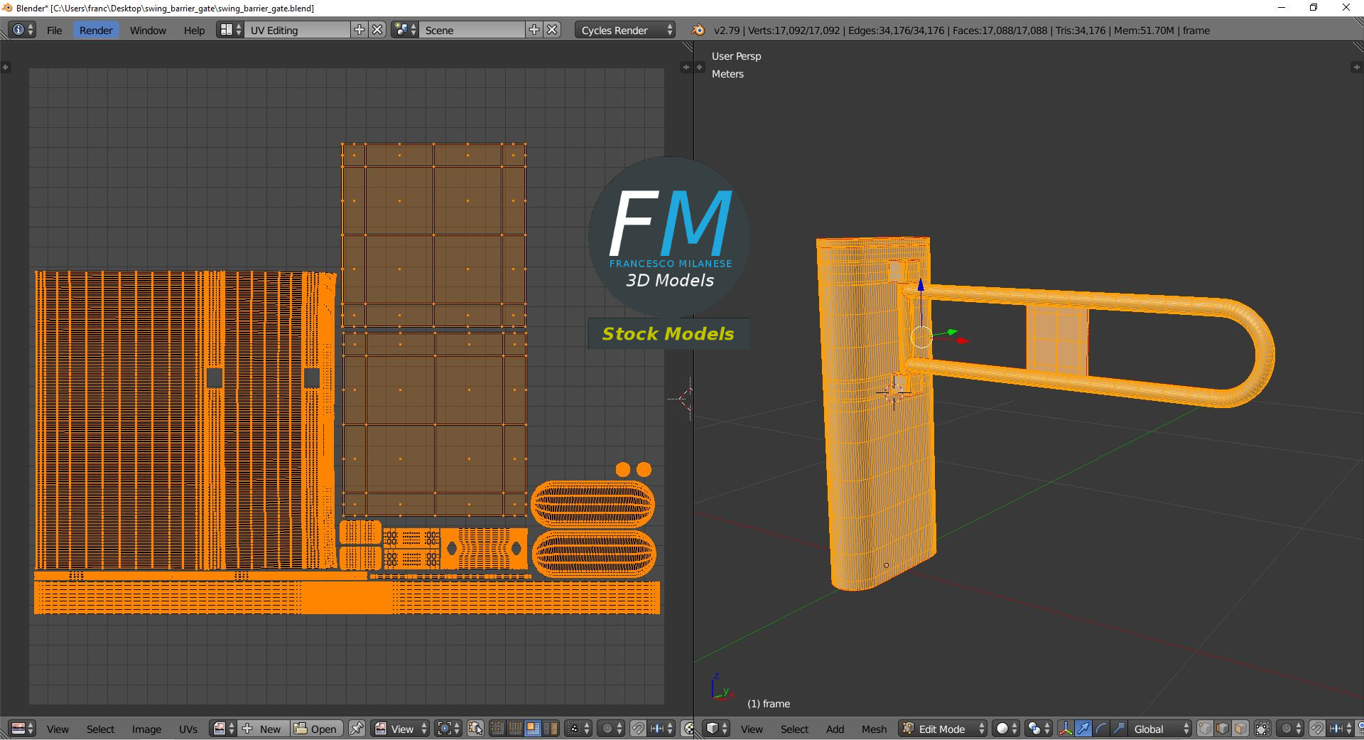 Polygonal, QUADS ONLY (no tris/ngons); 17092 vertices, 17088 quad faces (34176 tris).