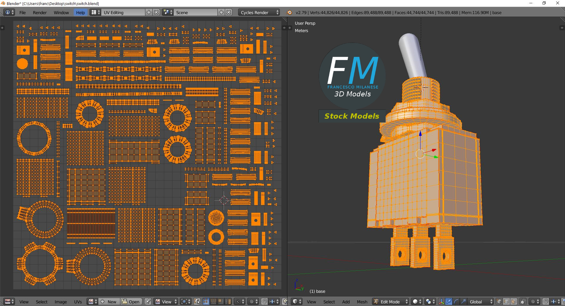 Electronic switch 3D Model. 2 individual objects (base, lever; so, you can easily rotate or even animate the lever), sharing the same non overlapping UV Layout map, Material and PBR Textures set. Production-ready 3D Model, with PBR materials, textures, non overlapping UV Layout map provided in the package.